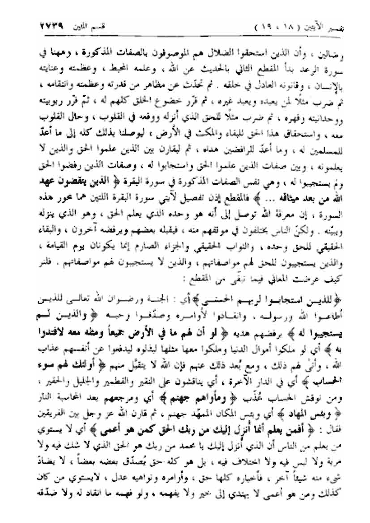 وضالين، وأن الذين استحقوا الضلال هم الموصوفون بالصفات المذكورة، وهاهنا في سورة الرعد بدأ المقطع الثاني بالحديث عن الله، وعلمه المحيط، وعظمته وعنايته بالإنسان، وقانونه العادل في خلقه. ثم تحدث عن مظاهر من قدرته وعظمته وانتقامه، ثم ضرب مثلا لمن يعبده ويعبد غيره، ثم قرر خضوع الخلق كلهم له، ثم قرر ربوبيته ووحدانيته وقهره، ثم ضرب مثلا للحق الذي أنزله ووقعه في القلوب، وحال القلوب معه، واستحقاق هذا الحق للبقاء والمكث في الأرض، ليوصلنا بذلك كله إلى ما أعد للمسلمين له، وما أعد للرافضين هداه، ثم ليقارن بين الذين علموا الحق والذين لا يعلمونه، وبين صفات الذين علموا الحق واستجابوا له، وصفات الذين رفضوا الحق ولم يستجيبوا له، وهي نفس الصفات المذكورة في سورة البقرة الَّذِينَ يَنْقُضُونَ عَهْدَ اللَّهِ مِنْ بَعْدِ مِيثاقِهِ ... فالمقطع إذن تفصيل لآيتي سورة البقرة اللتين هما محور هذه السورة، إن معرفة الله توصل إلى أنه هو وحده الذي يعلم الحق، وهو الذي ينزله ويبينه. ولكن الناس يختلفون في موقفهم منه، فيقبله بعضهم ويرفضه آخرون، والبقاء الحقيقي للحق وحده، والثواب الحقيقي والجزاء الصارم إنما يكونان يوم القيامة، والذين يستجيبون للحق لهم مواصفاتهم، والذين لا يستجيبون لهم مواصفاتهم. فلنر كيف عرضت المعاني فيما تبقى من المقطع: