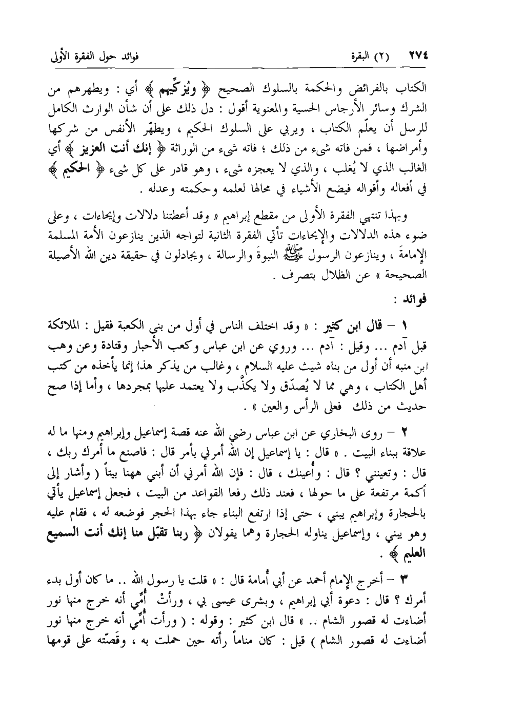 الكتاب بالفرائض والحكمة بالسلوك الصحيح وَيُزَكِّيهِمْ أي: ويطهرهم من الشرك وسائر الأرجاس الحسية والمعنوية أقول: دل ذلك على أن شأن الوارث الكامل للرسل أن يعلم الكتاب، ويربي على السلوك الحكيم، ويطهر الأنفس من شركها وأمراضها، فمن فاته شئ من ذلك؛ فاته شئ من الوراثة إِنَّكَ أَنْتَ الْعَزِيزُ أي الغالب الذي لا يغلب، والذي لا يعجزه شئ، وهو قادر على كل شئ الْحَكِيمُ في أفعاله وأقواله فيضع الأشياء في محالها لعلمه وحكمته وعدله.