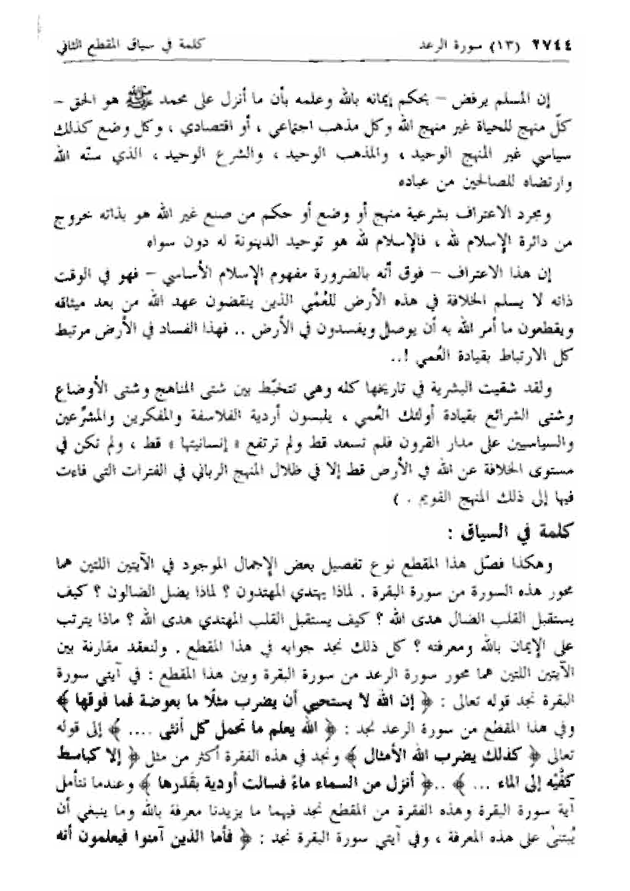 وهكذا فصل هذا المقطع نوع تفصيل بعض الإجمال الموجود في الآيتين اللتين هما محور هذه السورة من سورة البقرة. لماذا يهتدي المهتدون؟ لماذا يضل الضالون؟ كيف يستقبل القلب الضال هدى الله؟ كيف يستقبل القلب المهتدي هدى الله؟ ماذا يترتب على الإيمان بالله ومعرفته؟ كل ذلك نجد جوابه في هذا المقطع. ولنعقد مقارنة بين الآيتين اللتين هما محور سورة الرعد من سورة البقرة وبين هذا المقطع. ولنعقد مقارنة بين الآيتين اللتين هما محور سورة الرعد من سورة البقرة وبين هذا المقطع: في آيتي سورة البقرة نجد قوله تعالى: إِنَّ اللَّهَ لا يَسْتَحْيِي أَنْ يَضْرِبَ مَثَلًا ما بَعُوضَةً فَما فَوْقَها وفي هذا المقطع من سورة الرعد نجد: اللَّهُ يَعْلَمُ ما تَحْمِلُ كُلُّ أُنْثى .... إلى قوله تعالى كَذلِكَ يَضْرِبُ اللَّهُ الْأَمْثالَ ونجد في هذه الفقرة أكثر من مثل إِلَّا كَباسِطِ كَفَّيْهِ إِلَى الْماءِ ..... أَنْزَلَ مِنَ السَّماءِ ماءً فَسالَتْ أَوْدِيَةٌ بِقَدَرِها وعند ما نتأمل آية سورة البقرة وهذه الفقرة من المقطع نجد فيهما ما يزيدنا معرفة بالله وما ينبغي أن يبتنى على هذه المعرفة، وفي آيتي سورة البقرة نجد: فَأَمَّا الَّذِينَ آمَنُوا فَيَعْلَمُونَ أَنَّهُ