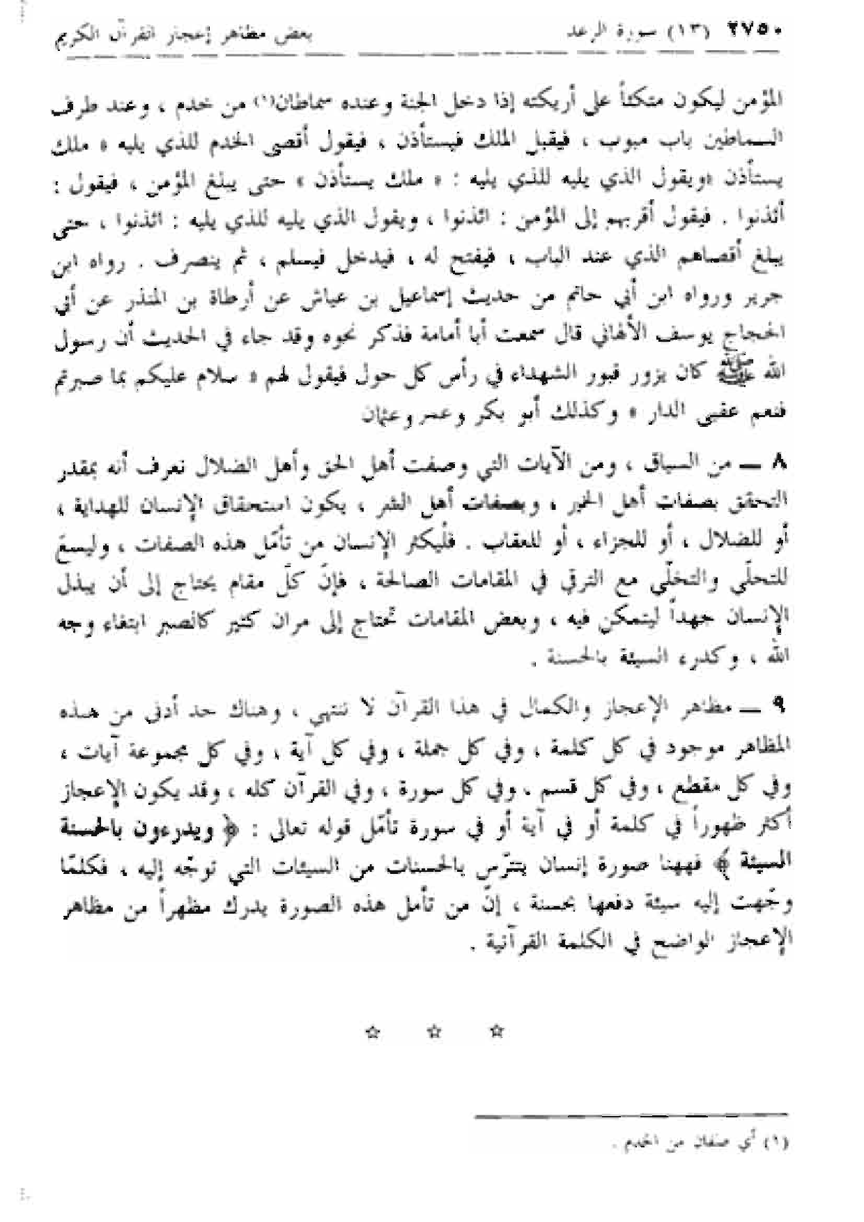 كل مقطع، وفي كل قسم، وفي كل سورة، وفي القرآن كله، وقد يكون الإعجاز أكثر ظهورا في كلمة أو في آية أو في سورة تأمل قوله تعالى: وَيَدْرَؤُنَ بِالْحَسَنَةِ السَّيِّئَةَ فههنا صورة إنسان يتترس بالحسنات من السيئات التي توجه إليه، فكلما وجهت إليه سيئة دفعها بحسنة، إن من تأمل هذه الصورة يدرك مظهرا من مظاهر الإعجاز الواضح في الكلمة القرآنية.