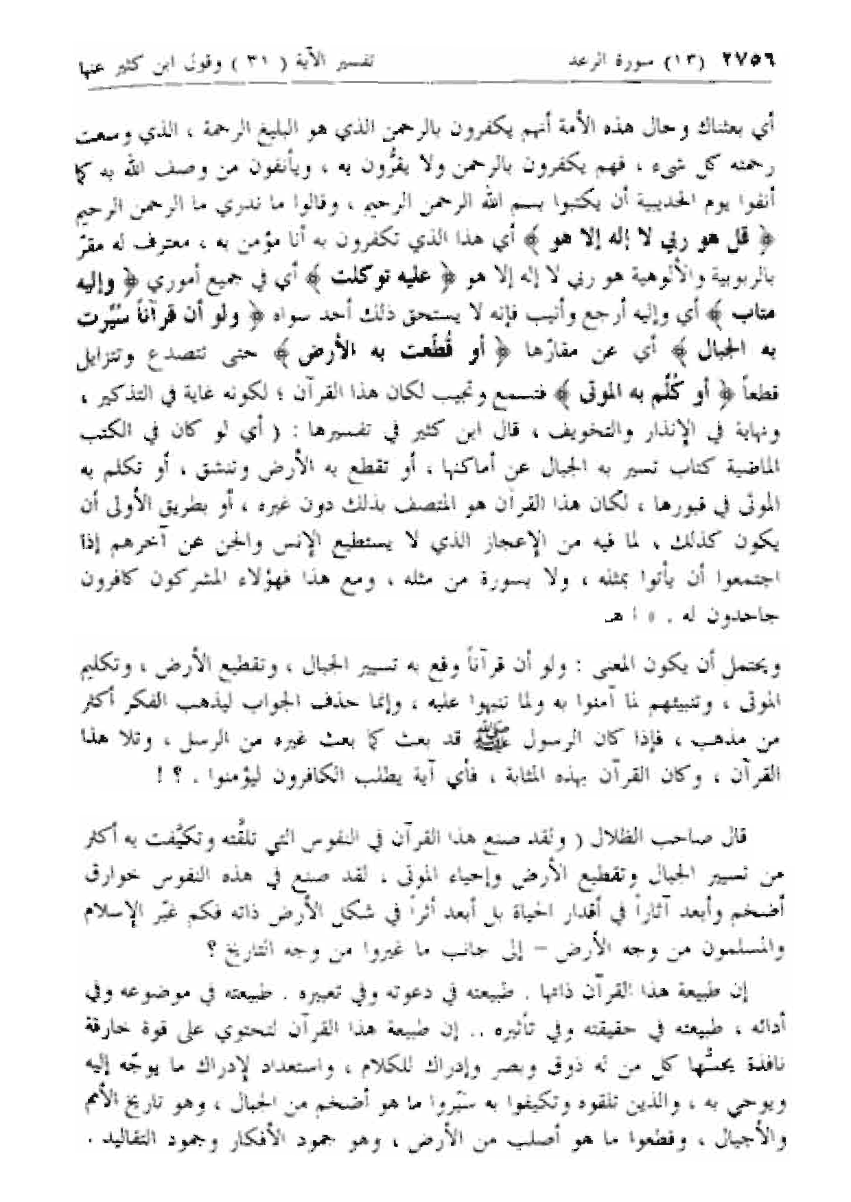 وَلَوْ أَنَّ قُرْآناً سُيِّرَتْ بِهِ الْجِبالُ أي عن مقارها أَوْ قُطِّعَتْ بِهِ الْأَرْضُ حتى تتصدع وتتزايل قطعا أَوْ كُلِّمَ بِهِ الْمَوْتى فتسمع وتجيب لكان هذا القرآن؛ لكونه غاية في التذكير، ونهاية في الإنذار والتخويف، قال ابن كثير في تفسيرها: (أي لو كان في الكتب الماضية كتاب تسير به الجبال عن أماكنها، أو تقطع به الأرض وتنشق، أو تكلم به الموتى في قبورها، لكان هذا القرآن هو المتصف بذلك دون غيره، أو بطريق الأولى أن يكون كذلك، لما فيه من الإعجاز الذي لا يستطيع الإنس والجن عن آخرهم إذا اجتمعوا أن يأتوا بمثله، ولا بسورة من مثله، ومع هذا فهؤلاء المشركون كافرون جاحدون له.» اه
