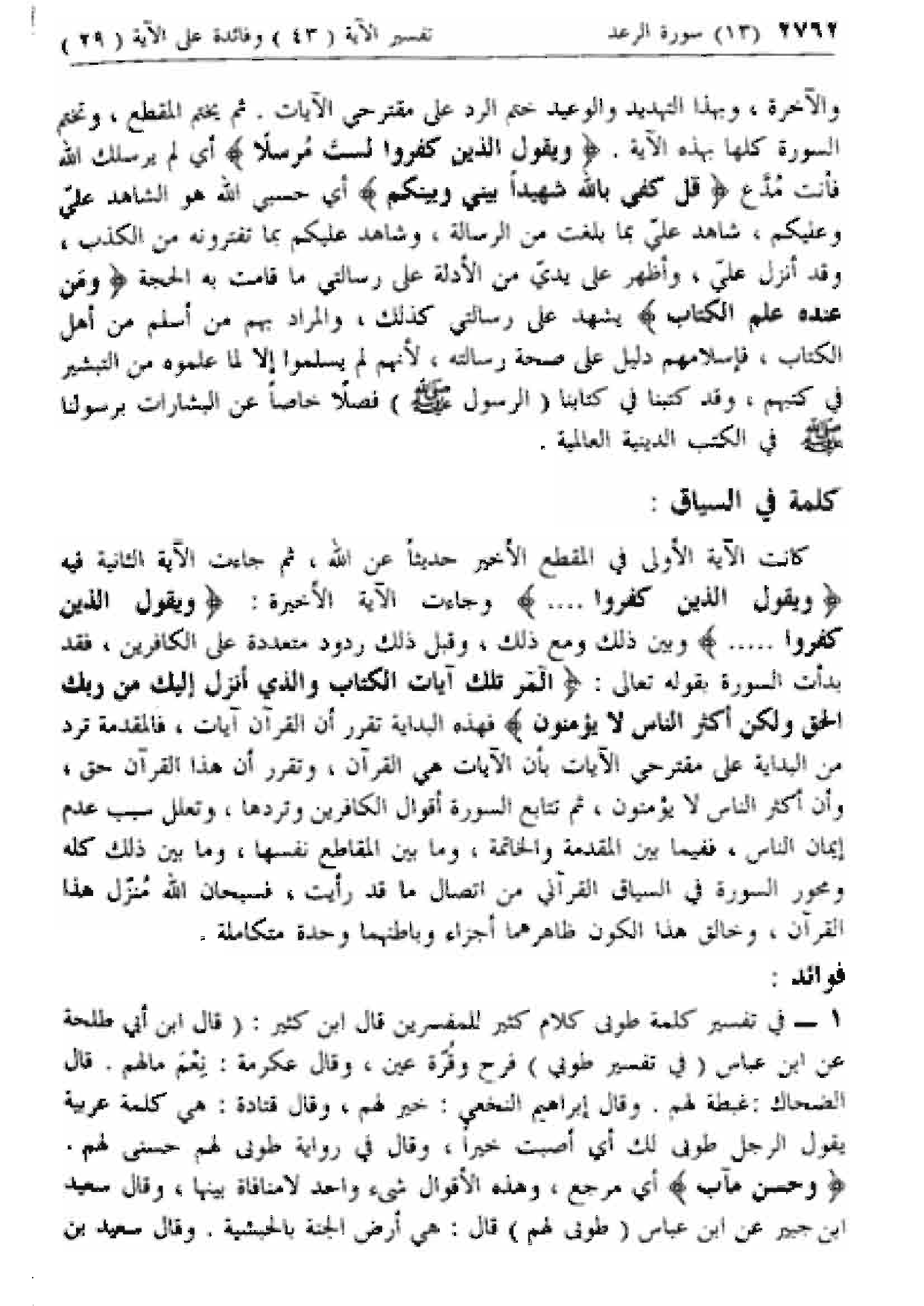 ثم يختم المقطع، وتختم السورة كلها بهذه الآية. وَيَقُولُ الَّذِينَ كَفَرُوا لَسْتَ مُرْسَلًا أي لم يرسلك الله فأنت مدع قُلْ كَفى بِاللَّهِ شَهِيداً بَيْنِي وَبَيْنَكُمْ أي حسبي الله هو الشاهد علي وعليكم، شاهد علي بما بلغت من الرسالة، وشاهد عليكم بما تفترونه من الكذب، وقد أنزل علي، وأظهر على يدي من الأدلة على رسالتي ما قامت به الحجة وَمَنْ عِنْدَهُ عِلْمُ الْكِتابِ يشهد على رسالتي كذلك، والمراد بهم من أسلم من أهل الكتاب، فإسلامهم دليل على صحة رسالته، لأنهم لم يسلموا إلا لما علموه من التبشير في كتبهم، وقد كتبنا في كتابنا (الرسول صلى الله عليه وسلم) فصلا خاصا عن البشارات برسولنا صلى الله عليه وسلم في الكتب الدينية العالمية.