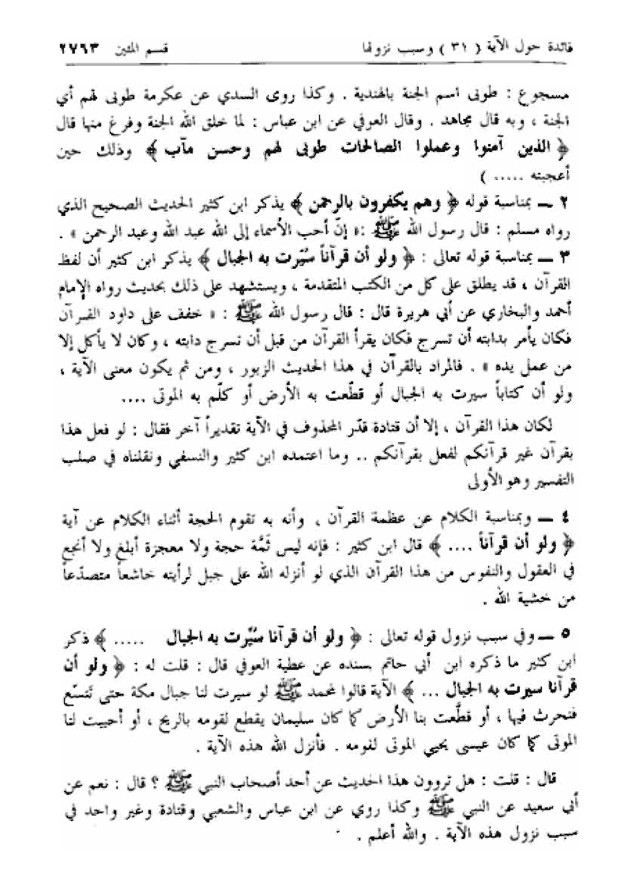3 - بمناسبة قوله تعالى: وَلَوْ أَنَّ قُرْآناً سُيِّرَتْ بِهِ الْجِبالُ يذكر ابن كثير أن لفظ القرآن، قد يطلق على كل من الكتب المتقدمة، ويستشهد على ذلك بحديث رواه الإمام أحمد والبخاري عن أبي هريرة قال: قال رسول الله صلى الله عليه وسلم: «خفف على داود القرآن فكان يأمر بدابته أن تسرج فكان يقرأ القرآن من قبل أن تسرج دابته، وكان لا يأكل إلا من عمل يده». فالمراد بالقرآن في هذا الحديث الزبور، ومن ثم يكون معنى الآية، ولو أن كتابا سيرت به الجبال أو قطعت به الأرض أو كلم به الموتى ....