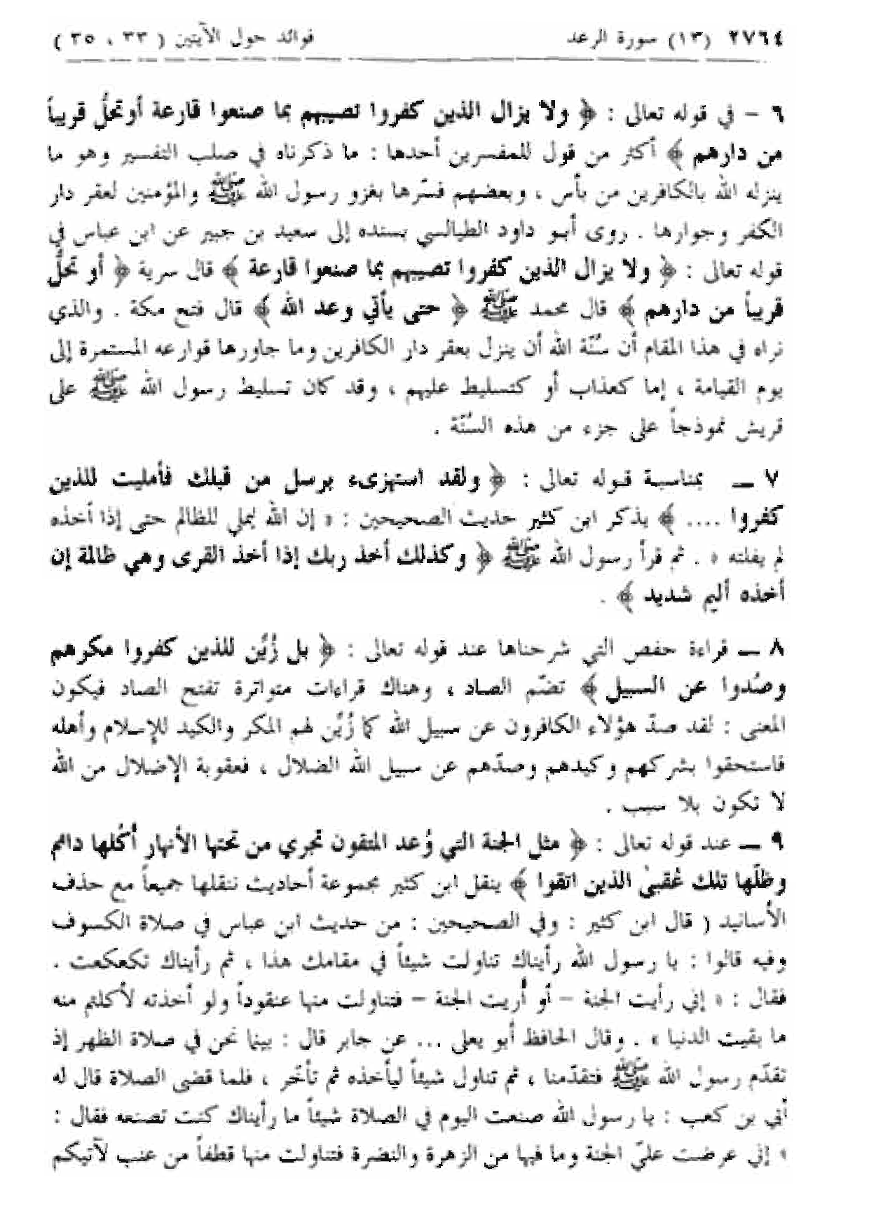 6 - في قوله تعالى: وَلا يَزالُ الَّذِينَ كَفَرُوا تُصِيبُهُمْ بِما صَنَعُوا قارِعَةٌ أَوْ تَحُلُّ قَرِيباً مِنْ دارِهِمْ أكثر من قول للمفسرين أحدها: ما ذكرناه في صلب التفسير وهو ما ينزله الله بالكافرين من بأس، وبعضهم فسرها بغزو رسول الله صلى الله عليه وسلم والمؤمنين لعقر دار الكفر وجوارها. روى أبو داود الطيالسي بسنده إلى سعيد بن جبير عن ابن عباس في قوله تعالى: وَلا يَزالُ الَّذِينَ كَفَرُوا تُصِيبُهُمْ بِما صَنَعُوا قارِعَةٌ قال سرية أَوْ تَحُلُّ قَرِيباً مِنْ دارِهِمْ قال محمد صلى الله عليه وسلم حَتَّى يَأْتِيَ وَعْدُ اللَّهِ قال فتح مكة. والذي نراه في هذا المقام أن سنة الله أن ينزل بعقر دار الكافرين وما جاورها قوارعه المستمرة إلى يوم القيامة، إما كعذاب أو كتسليط عليهم، وقد كان تسليط رسول الله صلى الله عليه وسلم على قريش نموذجا على جزء من هذه السنة.