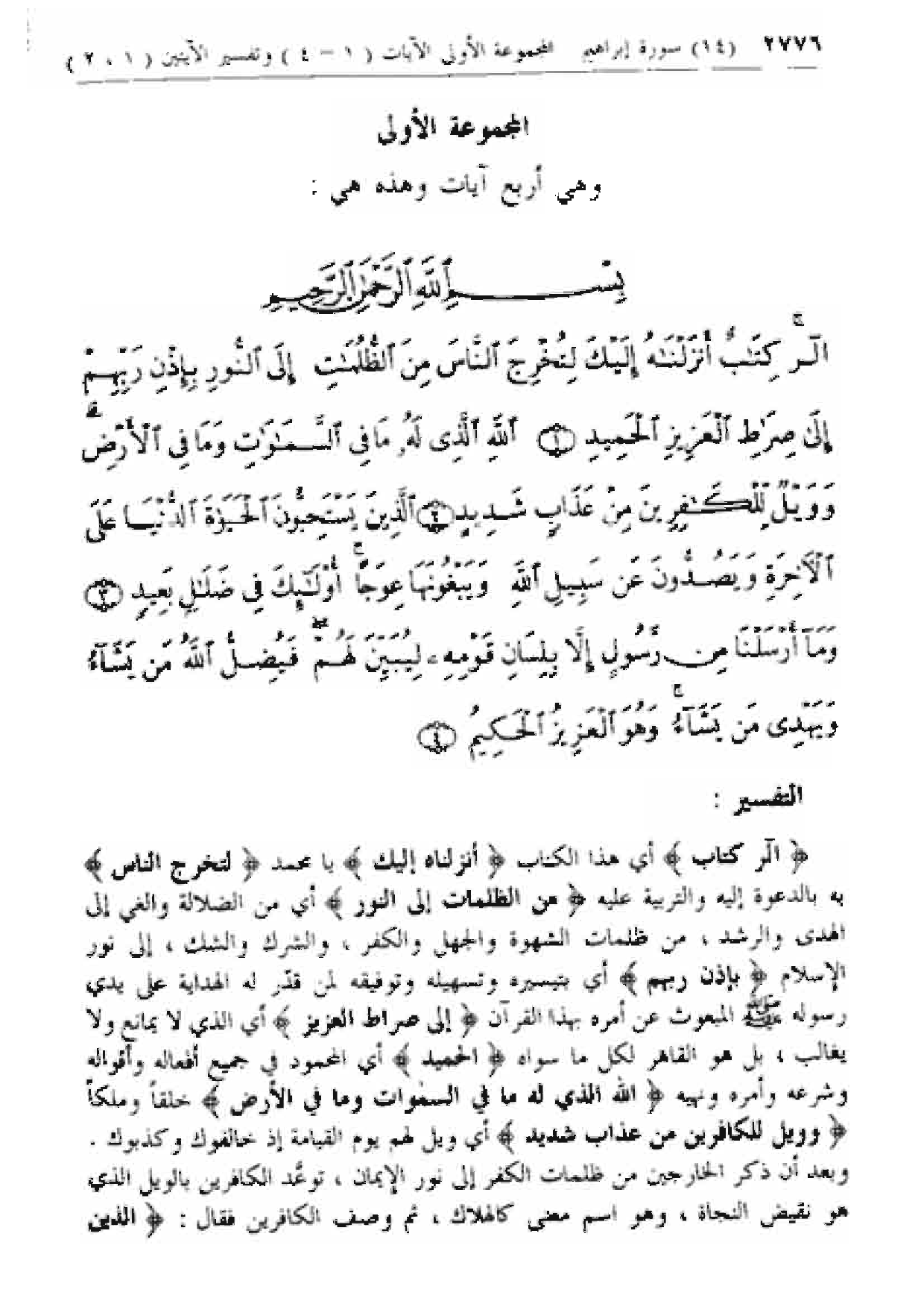الر كِتابٌ أي هذا الكتاب أَنْزَلْناهُ إِلَيْكَ يا محمد لِتُخْرِجَ النَّاسَ به بالدعوة إليه والتربية عليه مِنَ الظُّلُماتِ إِلَى النُّورِ أي من الضلالة والغي إلى الهدى والرشد، من ظلمات الشهوة والجهل والكفر، والشرك والشك، إلى نور الإسلام بِإِذْنِ رَبِّهِمْ أي بتيسيره وتسهيله وتوفيقه لمن قدر له الهداية على يدي رسوله صلى الله عليه وسلم المبعوث عن أمره بهذا القرآن إِلى صِراطِ الْعَزِيزِ أي الذي لا يمانع ولا يغالب، بل هو القاهر لكل ما سواه الْحَمِيدِ أي المحمود في جميع أفعاله وأقواله وشرعه وأمره ونهيه