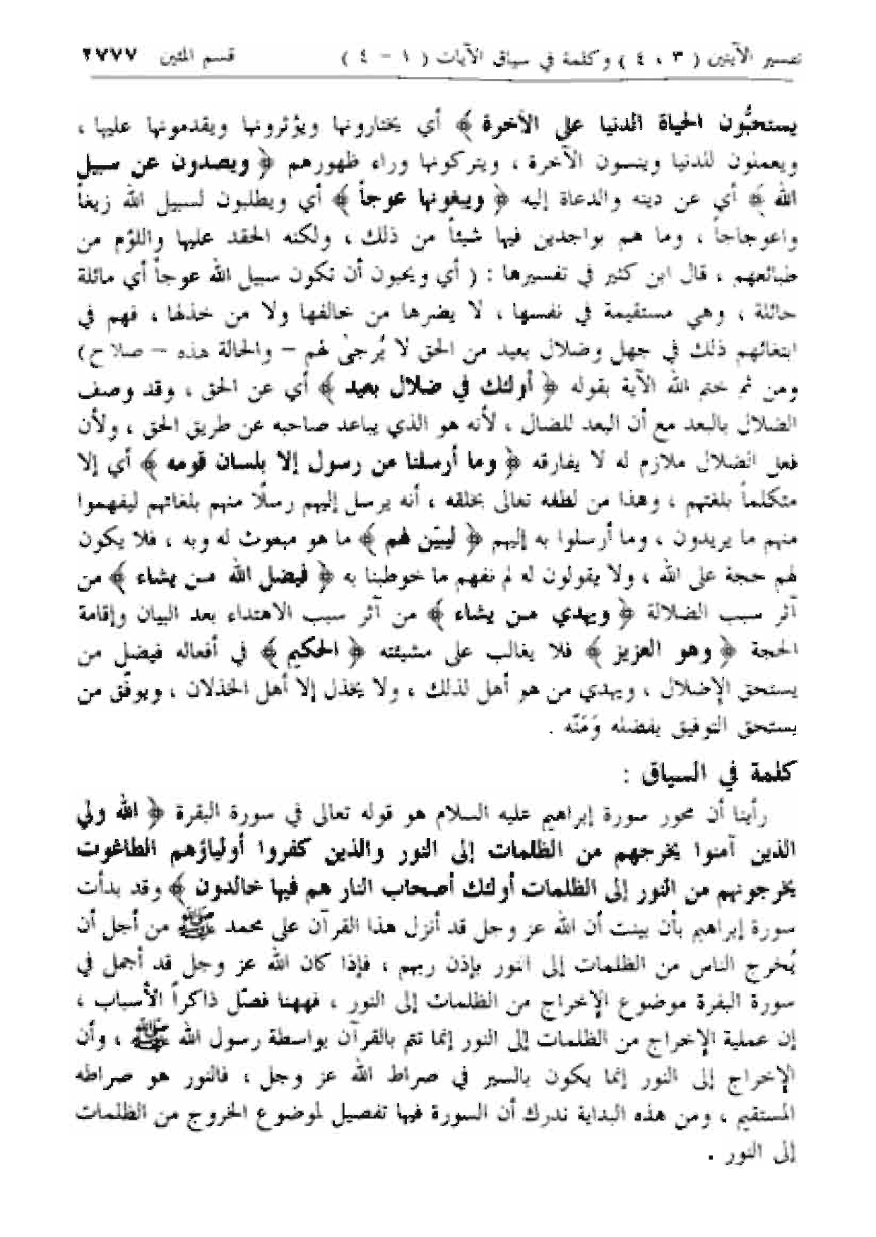 يَسْتَحِبُّونَ الْحَياةَ الدُّنْيا عَلَى الْآخِرَةِ أي يختارونها ويؤثرونها ويقدمونها عليها، ويعملون للدنيا وينسون الآخرة، ويتركونها وراء ظهورهم وَيَصُدُّونَ عَنْ سَبِيلِ اللَّهِ أي عن دينه والدعاة إليه وَيَبْغُونَها عِوَجاً أي ويطلبون لسبيل الله زيغا واعوجاجا، وما هم بواجدين فيها شيئا من ذلك، ولكنه الحقد عليها واللؤم من طبائعهم، قال ابن كثير في تفسيرها: (أي ويحبون أن تكون سبيل الله عوجا أي مائلة حائلة، وهي مستقيمة في نفسها، لا يضرها من خالفها ولا من خذلها، فهم في ابتغائهم ذلك في جهل وضلال بعيد من الحق لا يرجى لهم- والحالة هذه- صلاح) ومن ثم ختم الله الآية بقوله أُولئِكَ فِي ضَلالٍ بَعِيدٍ أي عن الحق، وقد وصف الضلال بالبعد مع أن البعد للضال، لأنه هو الذي يباعد صاحبه عن طريق الحق، ولأن فعل الضلال ملازم له لا يفارقه