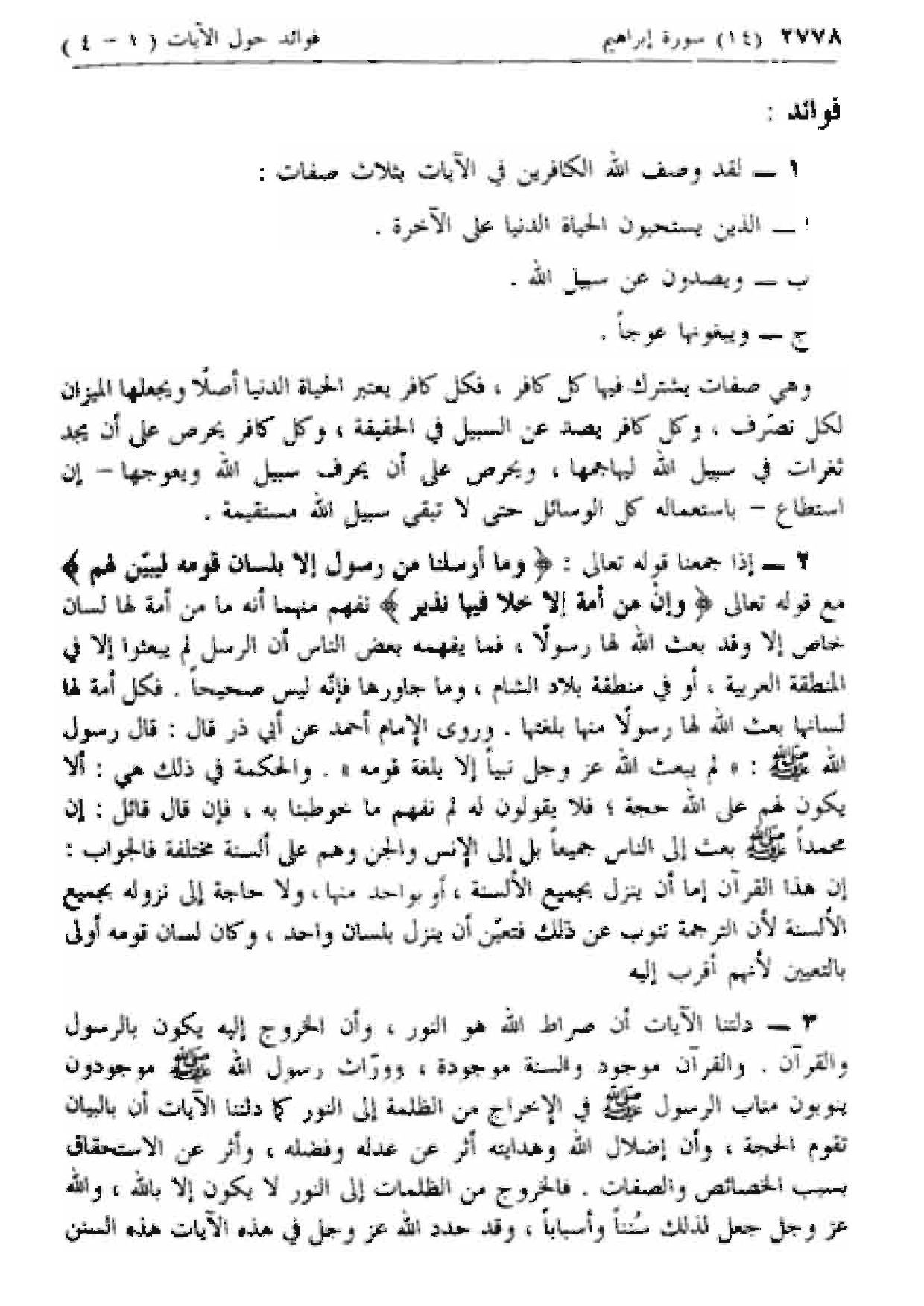 2 - إذا جمعنا قوله تعالى: وَما أَرْسَلْنا مِنْ رَسُولٍ إِلَّا بِلِسانِ قَوْمِهِ لِيُبَيِّنَ لَهُمْ مع قوله تعالى وَإِنْ مِنْ أُمَّةٍ إِلَّا خَلا فِيها نَذِيرٌ نفهم منهما أنه ما من أمة لها لسان خاص إلا وقد بعث الله لها رسولا، فما يفهمه بعض الناس أن الرسل لم يبعثوا إلا في المنطقة العربية، أو في منطقة بلاد الشام، وما جاورها فإنه ليس صحيحا. فكل أمة لها لسانها بعث الله لها رسولا منها بلغتها. وروى الإمام أحمد عن أبي ذر قال: قال رسول الله صلى الله عليه وسلم: «لم يبعث الله عزّ وجل نبيا إلا بلغة قومه». والحكمة في ذلك هي: ألا يكون لهم على الله حجة؛ فلا يقولون له لم نفهم ما خوطبنا به، فإن قال قائل: إن محمدا صلى الله عليه وسلم بعث إلى الناس جميعا بل إلى الإنس والجن وهم على ألسنة مختلفة فالجواب: