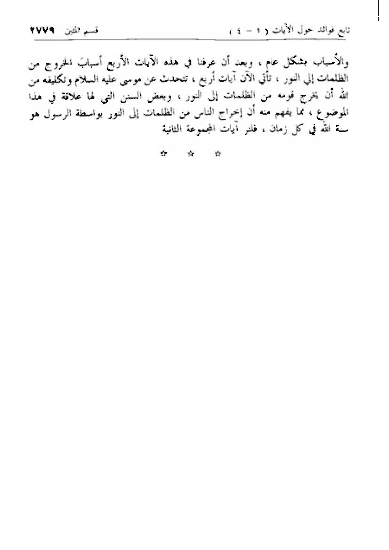 والأسباب بشكل عام، وبعد أن عرفنا في هذه الآيات الأربع أسباب الخروج من الظلمات إلى النور، تأتي الآن آيات أربع، تتحدث عن موسى عليه السلام وتكليفه من الله أن يخرج قومه من الظلمات إلى النور، وبعض السنن التي لها علاقة في هذا الموضوع، مما يفهم منه أن إخراج الناس من الظلمات إلى النور بواسطة الرسول هو سنة الله في كل زمان، فلنر آيات المجموعة الثانية
