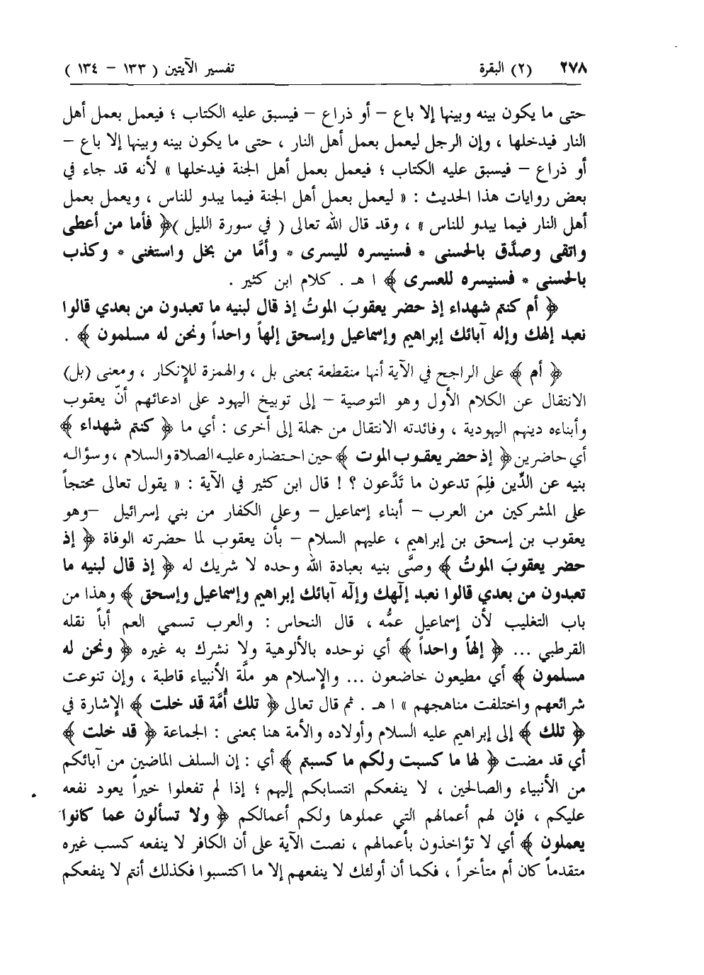أَمْ على الراجح في الآية أنها منقطعة بمعنى بل، والهمزة للإنكار، ومعنى (بل) الانتقال عن الكلام الأول وهو التوصية- إلى توبيخ اليهود على ادعائهم أن يعقوب وأبناءه دينهم اليهودية، وفائدته الانتقال من جملة إلى أخرى: أي ما كُنْتُمْ شُهَداءَ أي حاضرين إِذْ حَضَرَ يَعْقُوبَ الْمَوْتُ حين احتضاره عليه الصلاة والسلام، وسؤاله بنيه عن الدين فلم تدعون ما تدعون؟! قال ابن كثير في الآية: «يقول تعالى محتجا على المشركين من العرب- أبناء إسماعيل- وعلى الكفار من بني إسرائيل- وهو يعقوب بن إسحاق بن إبراهيم، عليهم السلام- بأن يعقوب لما حضرته الوفاة إِذْ حَضَرَ يَعْقُوبَ الْمَوْتُ وصى بنيه بعبادة الله وحده لا شريك له إِذْ قالَ لِبَنِيهِ ما تَعْبُدُونَ مِنْ بَعْدِي قالُوا نَعْبُدُ إِلهَكَ وَإِلهَ آبائِكَ إِبْراهِيمَ وَإِسْماعِيلَ وَإِسْحاقَ وهذا من باب التغليب لأن إسماعيل عمه، قال النحاس: والعرب تسمي العم أبا نقله القرطبي ... إِلهاً واحِداً أي نوحده