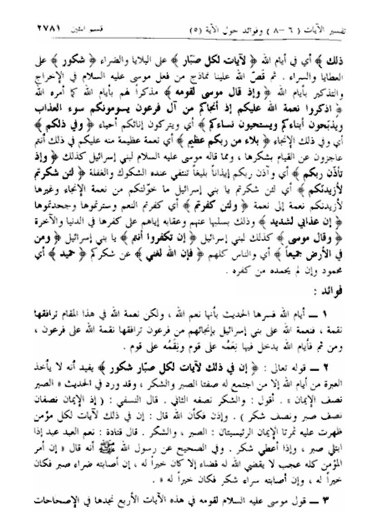 2 - قوله تعالى: إِنَّ فِي ذلِكَ لَآياتٍ لِكُلِّ صَبَّارٍ شَكُورٍ يفيد أنه لا يأخذ العبرة من أيام الله إلا من اجتمع له صفتا الصبر والشكر، وقد ورد في الحديث «الصبر نصف الإيمان». أقول: والشكر نصفه الثاني. قال النسفي: (إذ الإيمان نصفان نصف صبر ونصف شكر). وإذن فكأن الله قال: إن في ذلك لآيات لكل مؤمن ظهرت عليه ثمرتا الإيمان الرئيسيتان: الصبر، والشكر. قال قتادة: نعم العبد عبد إذا ابتلي صبر، وإذا أعطي شكر. وفي الصحيح عن رسول الله صلى الله عليه وسلم أنه قال «إن أمر المؤمن كله عجب لا يقضي الله له قضاء إلا كان خيرا له، إن أصابته ضراء صبر فكان خيرا له، وإن أصابته سراء شكر فكان خيرا له».