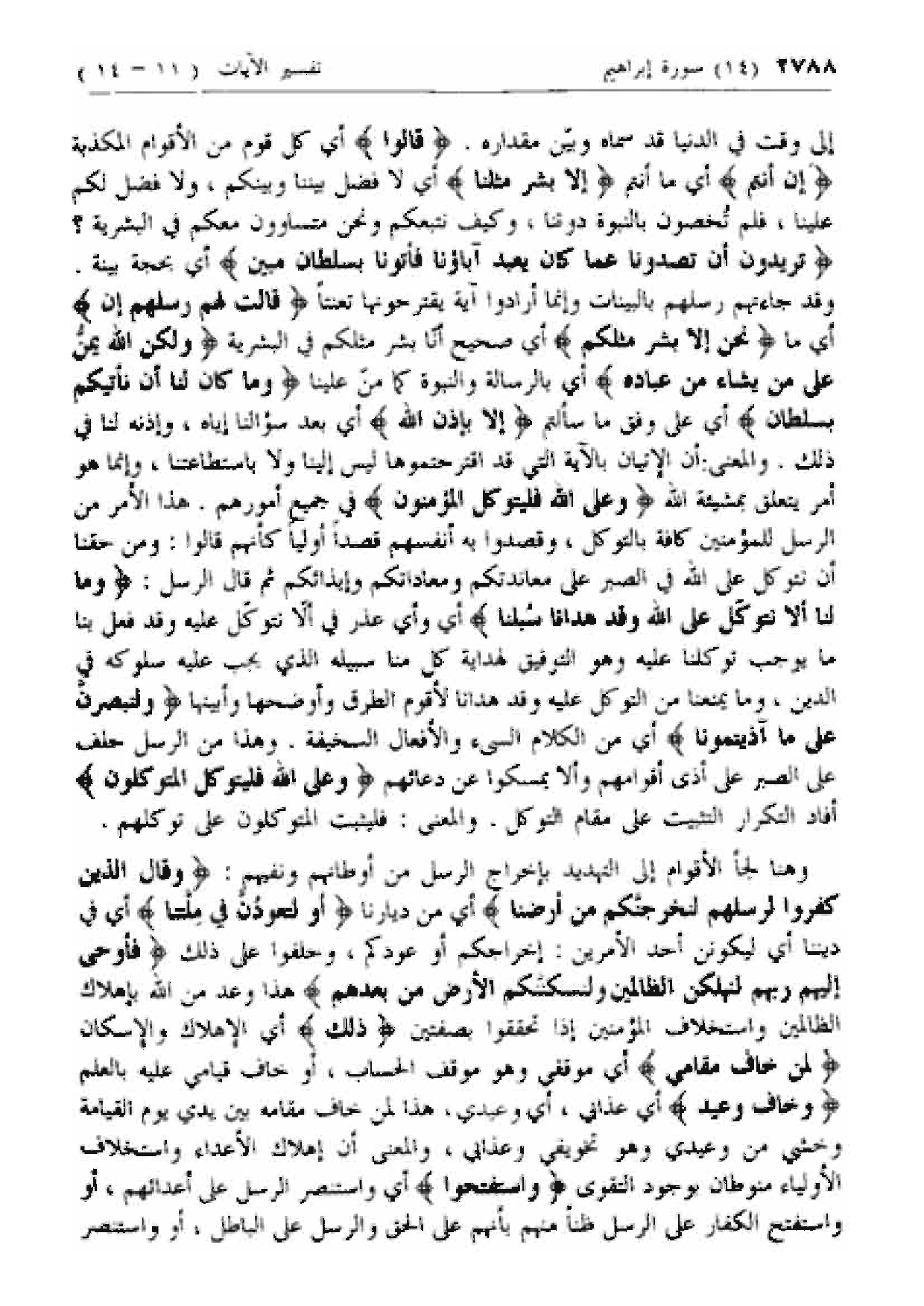 قالَتْ لَهُمْ رُسُلُهُمْ إِنْ أي ما نَحْنُ إِلَّا بَشَرٌ مِثْلُكُمْ أي صحيح أنا بشر مثلكم في البشرية وَلكِنَّ اللَّهَ يَمُنُّ عَلى مَنْ يَشاءُ مِنْ عِبادِهِ أي بالرسالة والنبوة كما من علينا وَما كانَ لَنا أَنْ نَأْتِيَكُمْ بِسُلْطانٍ أي على وفق ما سألتم إِلَّا بِإِذْنِ اللَّهِ أي بعد سؤالنا إياه، وإذنه لنا في ذلك. والمعنى: أن الإتيان بالآية التي قد اقترحتموها ليس إلينا ولا باستطاعتنا، وإنما هو أمر يتعلق بمشيئة الله وَعَلَى اللَّهِ فَلْيَتَوَكَّلِ الْمُؤْمِنُونَ في جميع أمورهم. هذا الأمر من الرسل للمؤمنين كافة بالتوكل، وقصدوا به أنفسهم قصدا أوليا كأنهم قالوا: ومن حقنا أن نتوكل على الله في الصبر على معاندتكم ومعاداتكم وإيذائكم