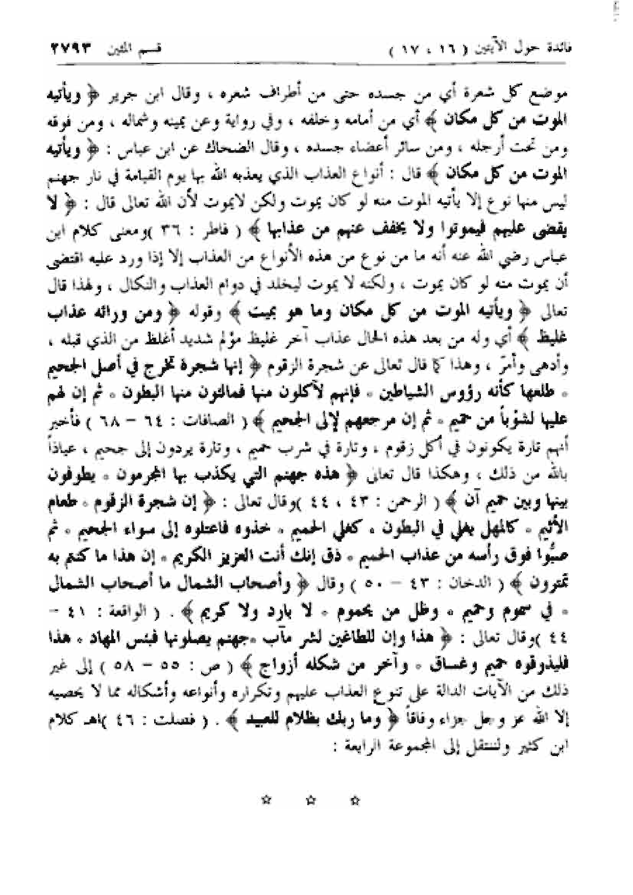 موضع كل شعرة أي من جسده حتى من أطراف شعره، وقال ابن جرير وَيَأْتِيهِ الْمَوْتُ مِنْ كُلِّ مَكانٍ أي من أمامه وخلفه، وفي رواية وعن يمينه وشماله، ومن فوقه ومن تحت أرجله، ومن سائر أعضاء جسده، وقال الضحاك عن ابن عباس: وَيَأْتِيهِ الْمَوْتُ مِنْ كُلِّ مَكانٍ قال: أنواع العذاب الذي يعذبه الله بها يوم القيامة في نار جهنم ليس منها نوع إلا يأتيه الموت منه لو كان يموت ولكن لا يموت لأن الله تعالى قال: لا يُقْضى عَلَيْهِمْ فَيَمُوتُوا وَلا يُخَفَّفُ عَنْهُمْ مِنْ عَذابِها (فاطر: 36) ومعنى كلام ابن عباس رضي الله عنه أنه ما من نوع من هذه الأنواع من العذاب إلا إذا ورد عليه اقتضى أن يموت منه لو كان يموت، ولكنه لا يموت ليخلد في دوام العذاب والنكال، ولهذا قال تعالى وَيَأْتِيهِ الْمَوْتُ مِنْ كُلِّ مَكانٍ وَما هُوَ بِمَيِّتٍ وقوله وَمِنْ وَرائِهِ عَذابٌ غَلِيظٌ أي وله من بعد هذه الحال عذاب آخر غليظ مؤلم شديد أغلظ من الذي قبله، وأدهى وأمر، وهذا كما قال تعالى عن شجرة الزقوم إِنَّها شَجَرَةٌ تَخْرُجُ فِي أَصْلِ الْجَحِيمِ* طَلْعُها كَأَنَّهُ رُؤُسُ الشَّياطِينِ* فَإِنَّهُمْ لَآكِلُونَ مِنْها فَمالِؤُنَ مِنْهَا الْبُطُونَ* ثُمَّ إِنَّ لَهُمْ عَلَيْها لَشَوْباً مِنْ حَمِيمٍ* ثُمَّ إِنَّ مَرْجِعَهُمْ لَإِلَى الْجَحِيمِ (الصافات: 64 - 68) فأخبر أنهم تارة يكونون في أكل زقوم، وتارة في شرب حميم، وتارة يردون إلى جحيم، عياذا بالله من ذلك، وهكذا قال تعالى هذِهِ جَهَنَّمُ الَّتِي يُكَذِّبُ بِهَا الْمُجْرِمُونَ* يَطُوفُونَ بَيْنَها وَبَيْنَ حَمِيمٍ آنٍ (الرحمن: 43، 44) وقال تعالى: إِنَّ شَجَرَةَ الزَّقُّومِ* طَعامُ الْأَثِيمِ* كَالْمُهْلِ يَغْلِي فِي الْبُطُونِ* كَغَلْيِ الْحَمِيمِ* خُذُوهُ فَاعْتِلُوهُ إِلى سَواءِ الْجَحِيمِ* ثُمَّ صُبُّوا فَوْقَ رَأْسِهِ مِنْ عَذابِ الْحَمِيمِ* ذُقْ إِنَّكَ أَنْتَ الْعَزِيزُ الْكَرِيمُ* إِنَّ هذا ما كُنْتُمْ بِهِ تَمْتَرُونَ (الدخان: 43 - 50) وقال وَأَصْحابُ الشِّمالِ ما أَصْحابُ الشِّمالِ* فِي سَمُومٍ وَحَمِيمٍ* وَظِلٍّ مِنْ يَحْمُومٍ* لا بارِدٍ وَلا كَرِيمٍ. (الواقعة: 41 - 44) وقال تعالى: هذا وَإِنَّ لِلطَّاغِينَ لَشَرَّ مَآبٍ* جَهَنَّمَ يَصْلَوْنَها فَبِئْسَ الْمِهادُ* هذا فَلْيَذُوقُوهُ حَمِيمٌ وَغَسَّاقٌ* وَآخَرُ مِنْ شَكْلِهِ أَزْواجٌ (ص: 55 - 58) إلى غير ذلك من الآيات الدالة على تنوع العذاب عليهم وتكراره وأنواعه وأشكاله مما لا يحصيه إلا الله عزّ وجل جزاء وفاقا وَما رَبُّكَ بِظَلَّامٍ لِلْعَبِيدِ. (فصلت: 46) اهـ كلام ابن كثير ولننتقل إلى المجموعة الرابعة: