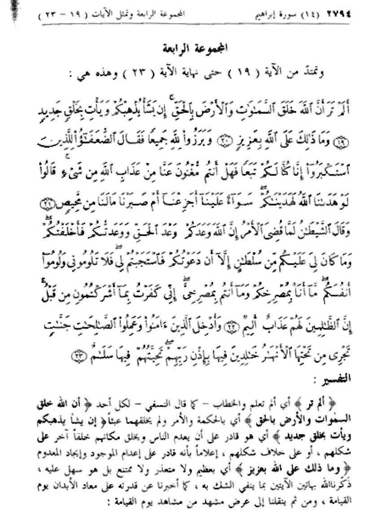 أَلَمْ تَرَ أي ألم تعلم والخطاب- كما قال النسفي- لكل أحد أَنَّ اللَّهَ خَلَقَ السَّماواتِ وَالْأَرْضَ بِالْحَقِّ أي بالحكمة والأمر ولم يخلقهما عبثا إِنْ يَشَأْ يُذْهِبْكُمْ وَيَأْتِ بِخَلْقٍ جَدِيدٍ أي هو قادر على أن يعدم الناس ويخلق مكانهم خلقا آخر على شكلهم، أو على خلاف شكلهم، إعلاما بأنه قادر على إعدام الموجود وإيجاد المعدوم