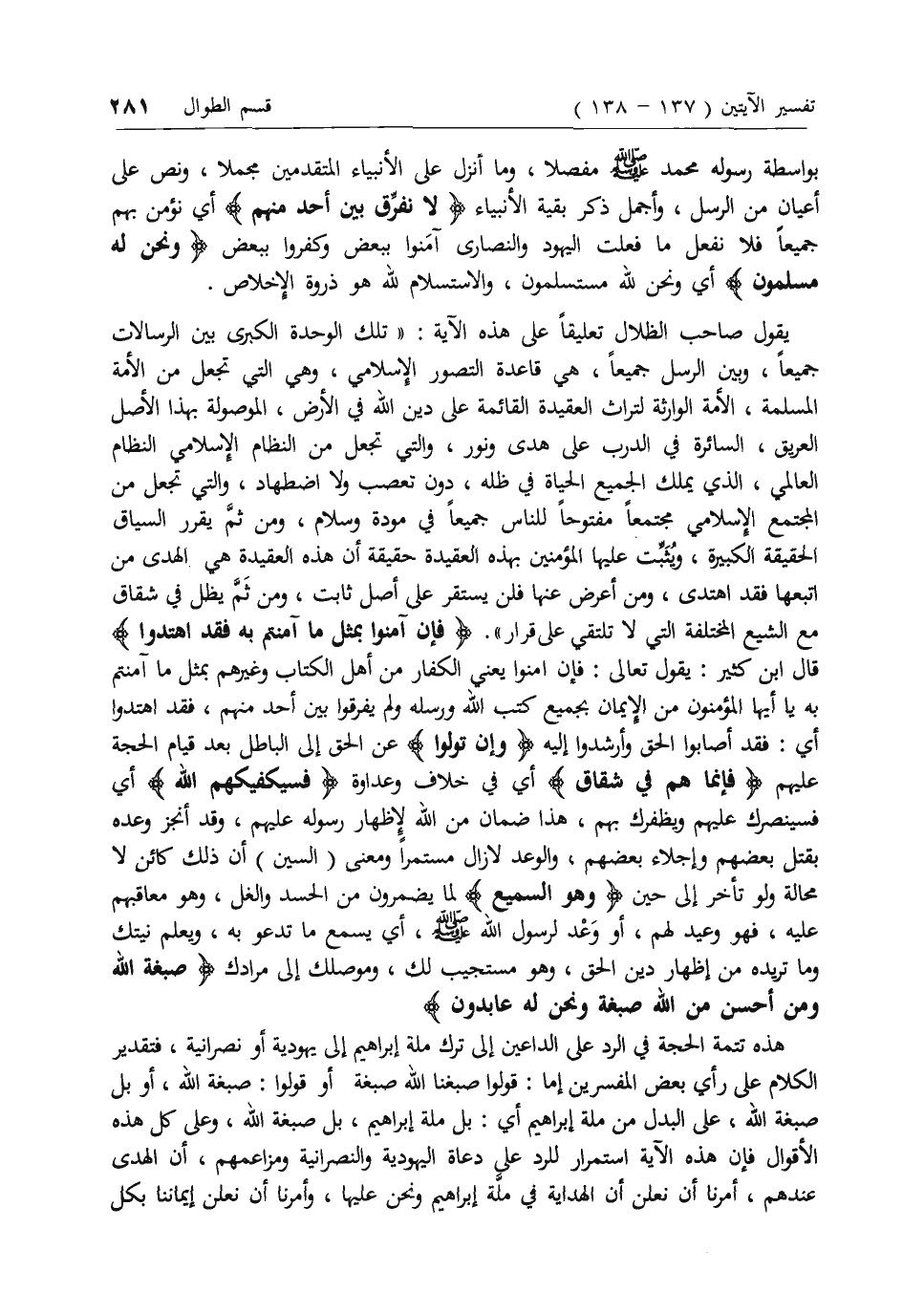يقول صاحب الظلال تعليقا على هذه الآية: «تلك الوحدة الكبرى بين الرسالات جميعا، وبين الرسل جميعا، هي قاعدة التصور الإسلامي، وهي التي تجعل من الأمة المسلمة، الأمة الوارثة لتراث العقيدة القائمة على دين الله في الأرض، الموصولة بهذا الأصل العريق، السائرة في الدرب على هدى ونور، والتي تجعل من النظام الإسلامي النظام العالمي، الذي يملك الجميع الحياة في ظله، دون تعصب ولا اضطهاد، والتي تجعل من المجتمع الإسلامي مجتمعا مفتوحا للناس جميعا في مودة وسلام، ومن ثم يقرر السياق الحقيقة الكبيرة، ويثبت عليها المؤمنين بهذه العقيدة حقيقة أن هذه العقيدة هي الهدى من اتبعها فقد اهتدى، ومن أعرض عنها فلن يستقر على أصل ثابت، ومن ثم يظل في شقاق مع الشيع المختلفة التي لا تلتقي على قرار».