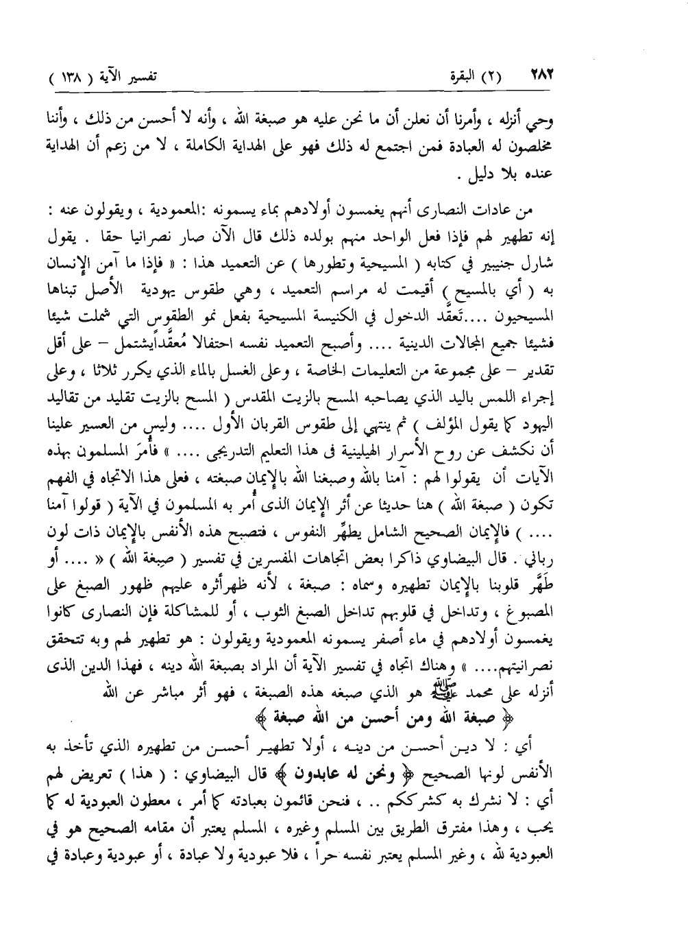 إنه تطهير لهم فإذا فعل الواحد منهم بولده ذلك قال الآن صار نصرانيا حقا. يقول شارل جنيبير في كتابه (المسيحية وتطورها) عن التعميد هذا: «فإذا ما آمن الإنسان به (أي بالمسيح) أقيمت له مراسم التعميد، وهي طقوس يهودية الأصل تبناها المسيحيون .... تعقد الدخول في الكنيسة المسيحية بفعل نمو الطقوس التي شملت شيئا فشيئا جميع المجالات الدينية .... وأصبح التعميد نفسه احتفالا معقدا يشتمل- على أقل تقدير- على مجموعة من التعليمات الخاصة، وعلى الغسل بالماء الذي يكرر ثلاثا، وعلى إجراء اللمس باليد الذي يصاحبه المسح بالزيت المقدس (المسح بالزيت تقليد من تقاليد اليهود كما يقول المؤلف) ثم ينتهي إلى طقوس القربان الأول .... وليس من العسير علينا أن نكشف عن روح الأسرار الهيلينية فى هذا التعليم التدريجى .... » فأمر المسلمون بهذه الآيات أن يقولوا لهم: آمنا بالله وصبغنا الله بالإيمان صبغته، فعلى هذا الاتجاه في الفهم تكون صِبْغَةَ اللَّهِ هنا حديثا عن أثر الإيمان الذى أمر به المسلمون في الآية قُولُوا آمَنَّا .... فالإيمان الصحيح الشامل يطهر النفوس، فتصبح هذه الأنفس بالإيمان ذات لون رباني. قال البيضاوي ذاكرا بعض اتجاهات المفسرين في تفسير صِبْغَةَ اللَّهِ « .... أو طهر قلوبنا بالإيمان تطهيره وسماه: صبغة، لأنه ظهر أثره عليهم ظهور الصبغ على المصبوغ، وتداخل في قلوبهم تداخل الصبغ الثوب، أو للمشاكلة فإن النصارى كانوا يغمسون أولادهم في ماء أصفر يسمونه المعمودية ويقولون: هو تطهير لهم وبه تتحقق نصرانيتهم .... » وهناك اتجاه في تفسير الآية أن المراد بصبغة الله دينه، فهذا الدين الذى أنزله على محمد صلى الله عليه وسلم هو الذي صبغه هذه الصبغة، فهو أثر مباشر عن الله