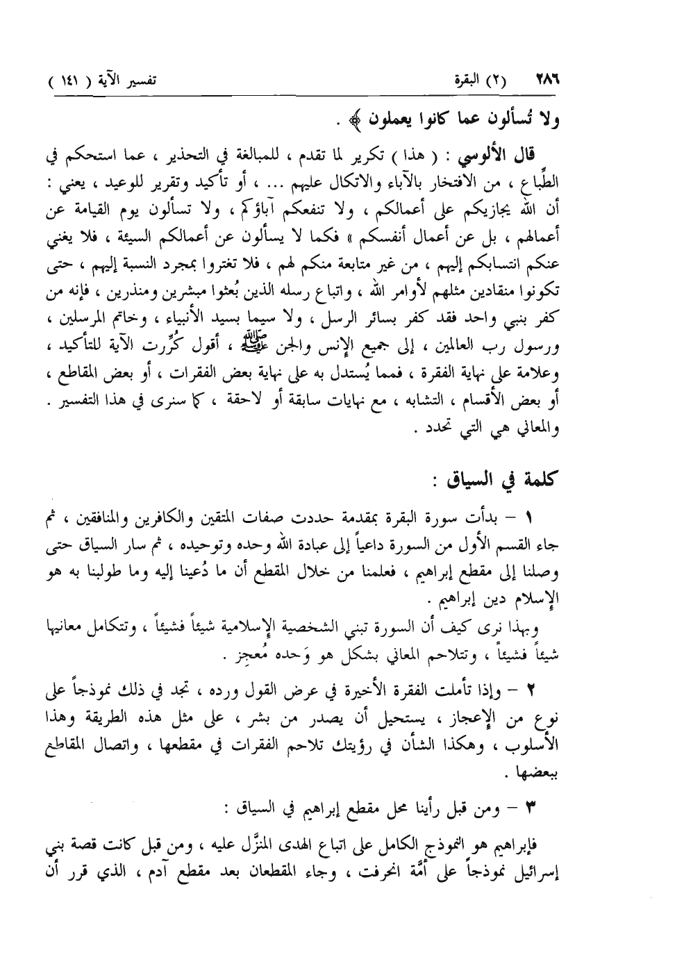 أن الله يجازيكم على أعمالكم، ولا تنفعكم آباؤكم، ولا تسألون يوم القيامة عن أعمالهم، بل عن أعمال أنفسكم» فكما لا يسألون عن أعمالكم السيئة، فلا يغني عنكم انتسابكم إليهم، من غير متابعة منكم لهم، فلا تغتروا بمجرد النسبة إليهم، حتى تكونوا منقادين مثلهم لأوامر الله، واتباع رسله الذين بعثوا مبشرين ومنذرين، فإنه من كفر بنبي واحد فقد كفر بسائر الرسل، ولا سيما بسيد الأنبياء، وخاتم المرسلين، ورسول رب العالمين، إلى جميع الإنس والجن صلى الله عليه وسلم، أقول كررت الآية للتأكيد، وعلامة على نهاية الفقرة، فمما يستدل به على نهاية بعض الفقرات، أو بعض المقاطع، أو بعض الأقسام، التشابه، مع نهايات سابقة أو لاحقة، كما سنرى في هذا التفسير.