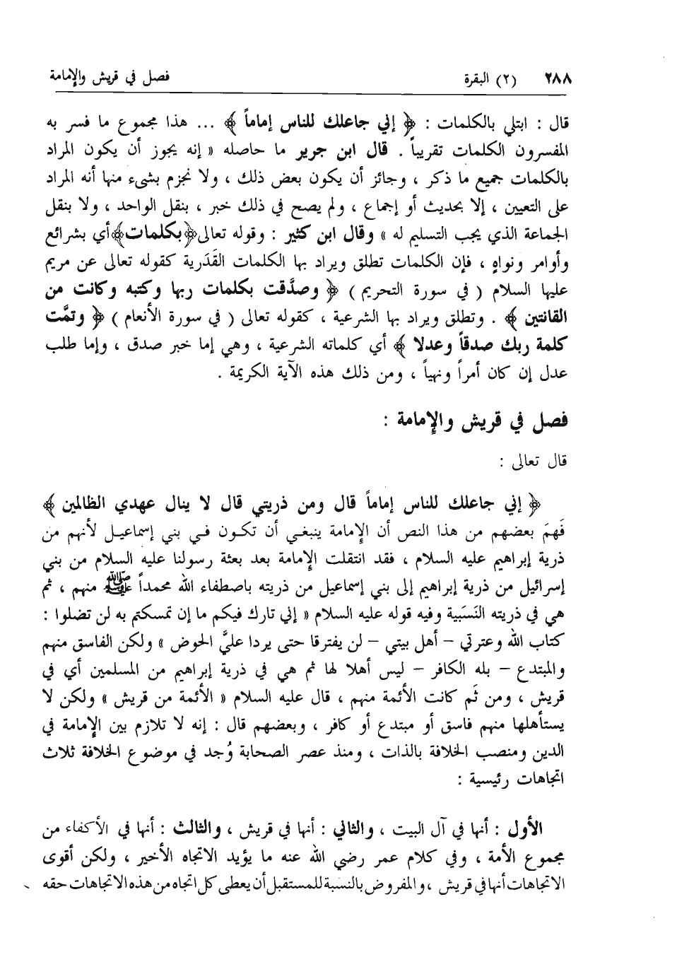 كتاب الله وعترتي- أهل بيتي- لن يفترقا حتى يردا علي الحوض» ولكن الفاسق منهم والمبتدع- بله الكافر- ليس أهلا لها ثم هي في ذرية إبراهيم من المسلمين أي في قريش، ومن ثم كانت الأئمة منهم، قال عليه السلام «الأئمة من قريش» ولكن لا يستأهلها منهم فاسق أو مبتدع أو كافر، وبعضهم قال: إنه لا تلازم بين الإمامة في الدين ومنصب الخلافة بالذات، ومنذ عصر الصحابة وجد في موضوع الخلافة ثلاث اتجاهات رئيسية: