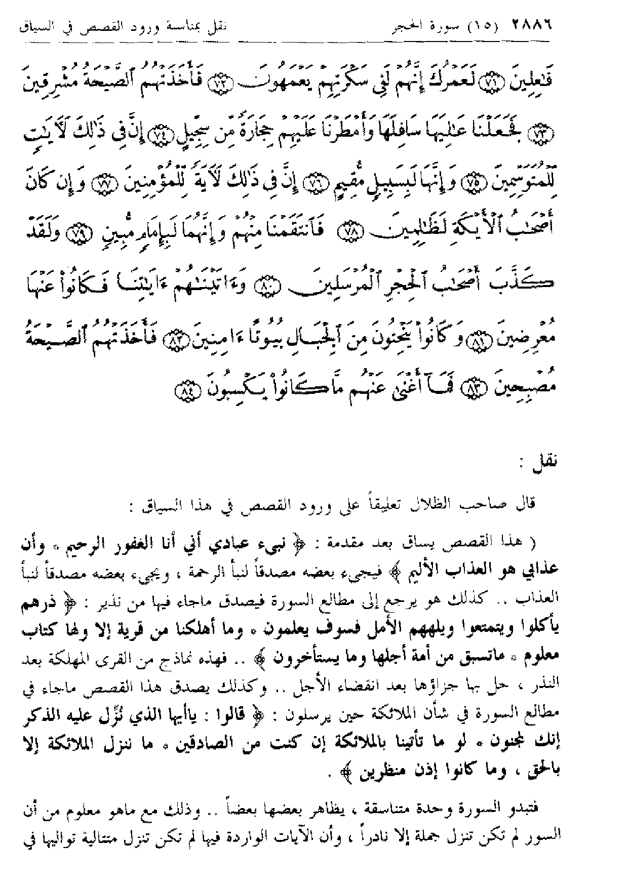 (هذا القصص يساق بعد مقدمة: نَبِّئْ عِبادِي أَنِّي أَنَا الْغَفُورُ الرَّحِيمُ* وَأَنَّ عَذابِي هُوَ الْعَذابُ الْأَلِيمُ فيجئ بعضه مصدقا لنبأ الرحمة، ويجئ بعضه مصدقا لنبأ العذاب .. كذلك هو يرجع إلى مطالع السورة فيصدق ما جاء فيها من نذير: ذَرْهُمْ يَأْكُلُوا وَيَتَمَتَّعُوا وَيُلْهِهِمُ الْأَمَلُ فَسَوْفَ يَعْلَمُونَ* وَما أَهْلَكْنا مِنْ قَرْيَةٍ إِلَّا وَلَها كِتابٌ مَعْلُومٌ* ما تَسْبِقُ مِنْ أُمَّةٍ أَجَلَها وَما يَسْتَأْخِرُونَ. فهذه نماذج من القرى المهلكة بعد النذر، حل بها جزاؤها بعد انقضاء الأجل .. وكذلك يصدق هذا القصص ما جاء في مطالع السورة في شأن الملائكة حين يرسلون: قالُوا: يا أَيُّهَا الَّذِي نُزِّلَ عَلَيْهِ الذِّكْرُ إِنَّكَ لَمَجْنُونٌ* لَوْ ما تَأْتِينا بِالْمَلائِكَةِ إِنْ كُنْتَ مِنَ الصَّادِقِينَ* ما نُنَزِّلُ الْمَلائِكَةَ إِلَّا بِالْحَقِّ، وَما كانُوا إِذاً مُنْظَرِينَ.