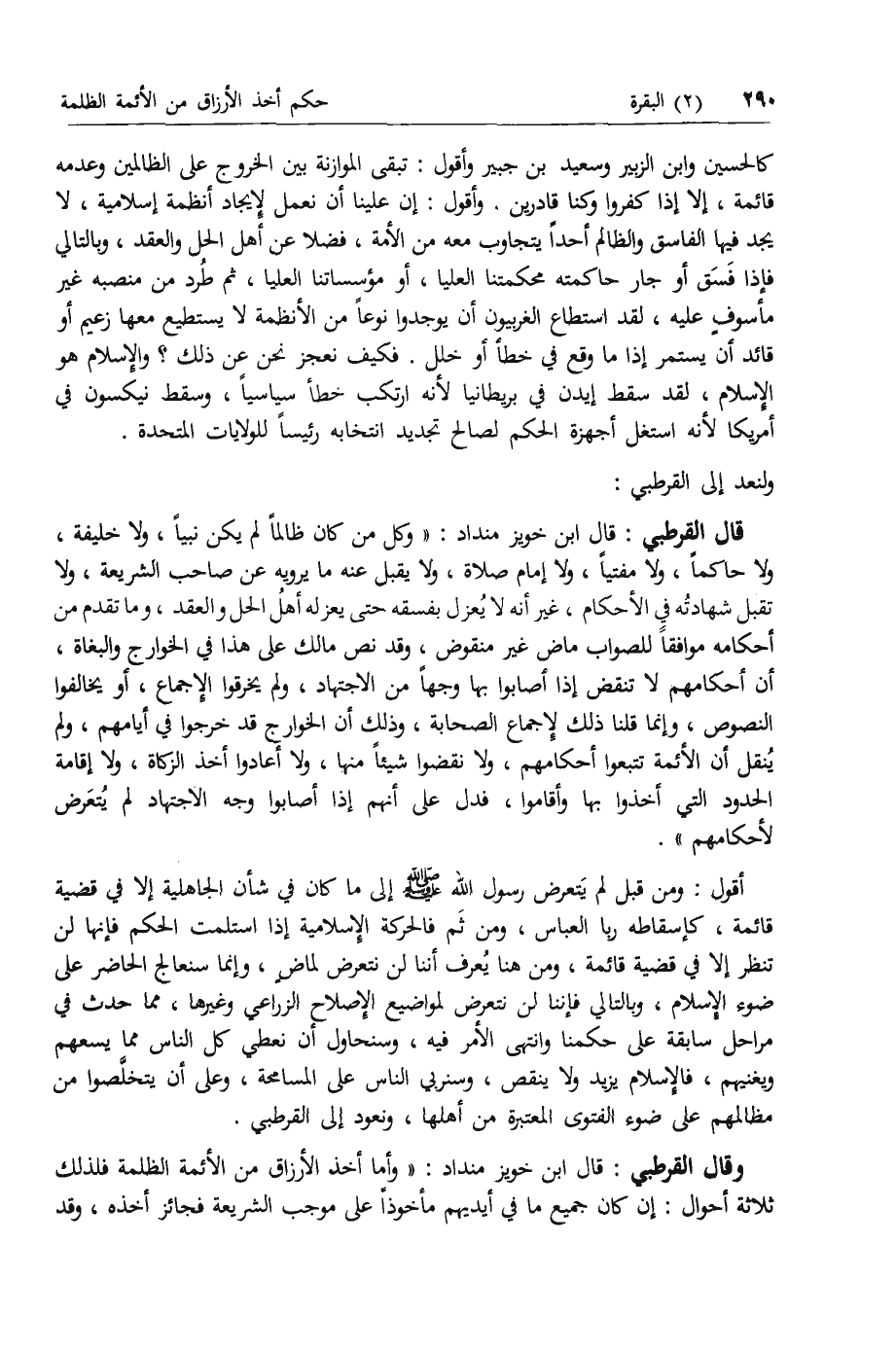 أقول: ومن قبل لم يتعرض رسول الله صلى الله عليه وسلم إلى ما كان في شأن الجاهلية إلا في قضية قائمة، كإسقاطه ربا العباس، ومن ثم فالحركة الإسلامية إذا استلمت الحكم فإنها لن تنظر إلا في قضية قائمة، ومن هنا يعرف أننا لن نتعرض لماض، وإنما سنعالج الحاضر على ضوء الإسلام، وبالتالي فإننا لن نتعرض لمواضيع الإصلاح الزراعي وغيرها، مما حدث في مراحل سابقة على حكمنا وانتهى الأمر فيه، وسنحاول أن نعطي كل الناس مما يسعهم ويغنيهم، فالإسلام يزيد ولا ينقص، وسنربي الناس على المسامحة، وعلى أن يتخلصوا من مظالمهم على ضوء الفتوى المعتبرة من أهلها، ونعود إلى القرطبي.