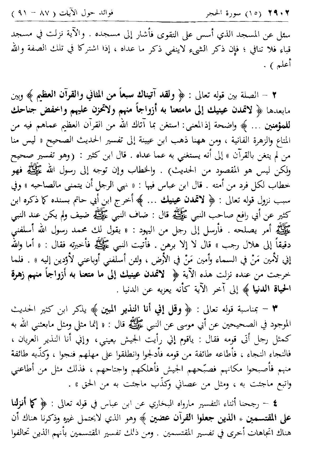 بمناسبة قوله تعالى: وَقُلْ إِنِّي أَنَا النَّذِيرُ الْمُبِينُ يذكر ابن كثير الحديث الموجود في الصحيحين عن أبي موسى عن النبي صلّى الله عليه وسلّم قال: «إنما مثلي ومثل ما بعثني الله به كمثل رجل أتى قومه فقال: يا قوم إني رأيت الجيش بعيني، وإني أنا النذير العريان، فالنجاء النجاء، فأطاعه طائفة من قومه فأدلجوا وانطلقوا على مهلهم فنجوا، وكذّبه طائفة منهم فأصبحوا مكانهم فصبّحهم الجيش فأهلكهم واجتاحهم، فذلك مثل من أطاعني واتبع ما جئت به، ومثل من عصاني وكذّب ما جئت به من الحق».