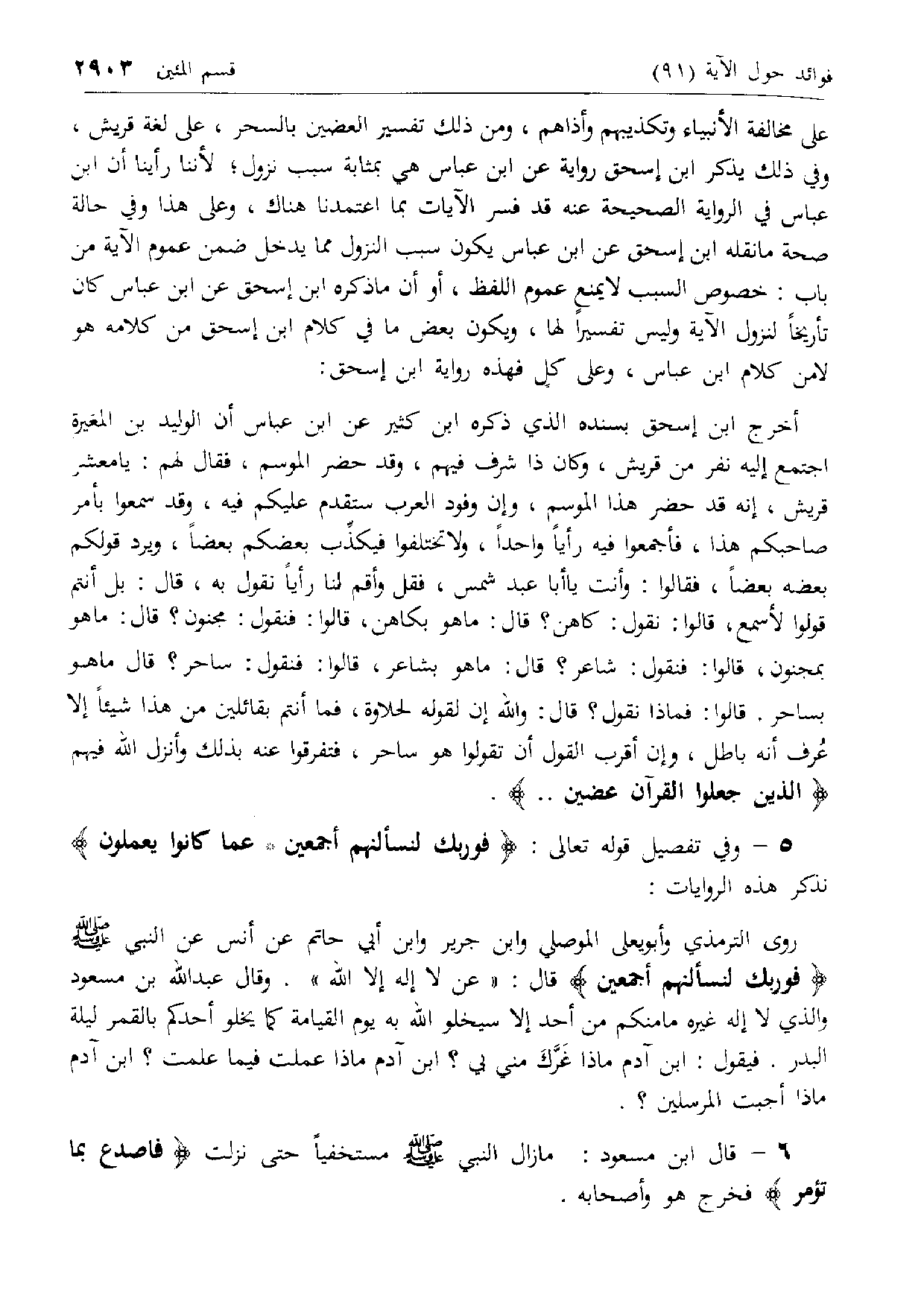 على مخالفة الأنبياء وتكذيبهم وأذاهم، ومن ذلك تفسير العضين بالسحر، على لغة قريش، وفي ذلك يذكر ابن إسحاق رواية عن ابن عباس هي بمثابة سبب نزول؛ لأننا رأينا أن ابن عباس في الرواية الصحيحة عنه قد فسر الآيات بما اعتمدنا هناك، وعلى هذا وفي حالة صحة ما نقله ابن إسحاق عن ابن عباس يكون سبب النزول مما يدخل ضمن عموم الآية من باب: خصوص السبب لا يمنع عموم اللفظ، أو أن ما ذكره ابن إسحاق عن ابن عباس كان تأريخا لنزول الآية وليس تفسيرا لها، ويكون بعض ما في كلام ابن إسحاق من كلامه هو لا من كلام ابن عباس، وعلى كل فهذه رواية ابن إسحاق: