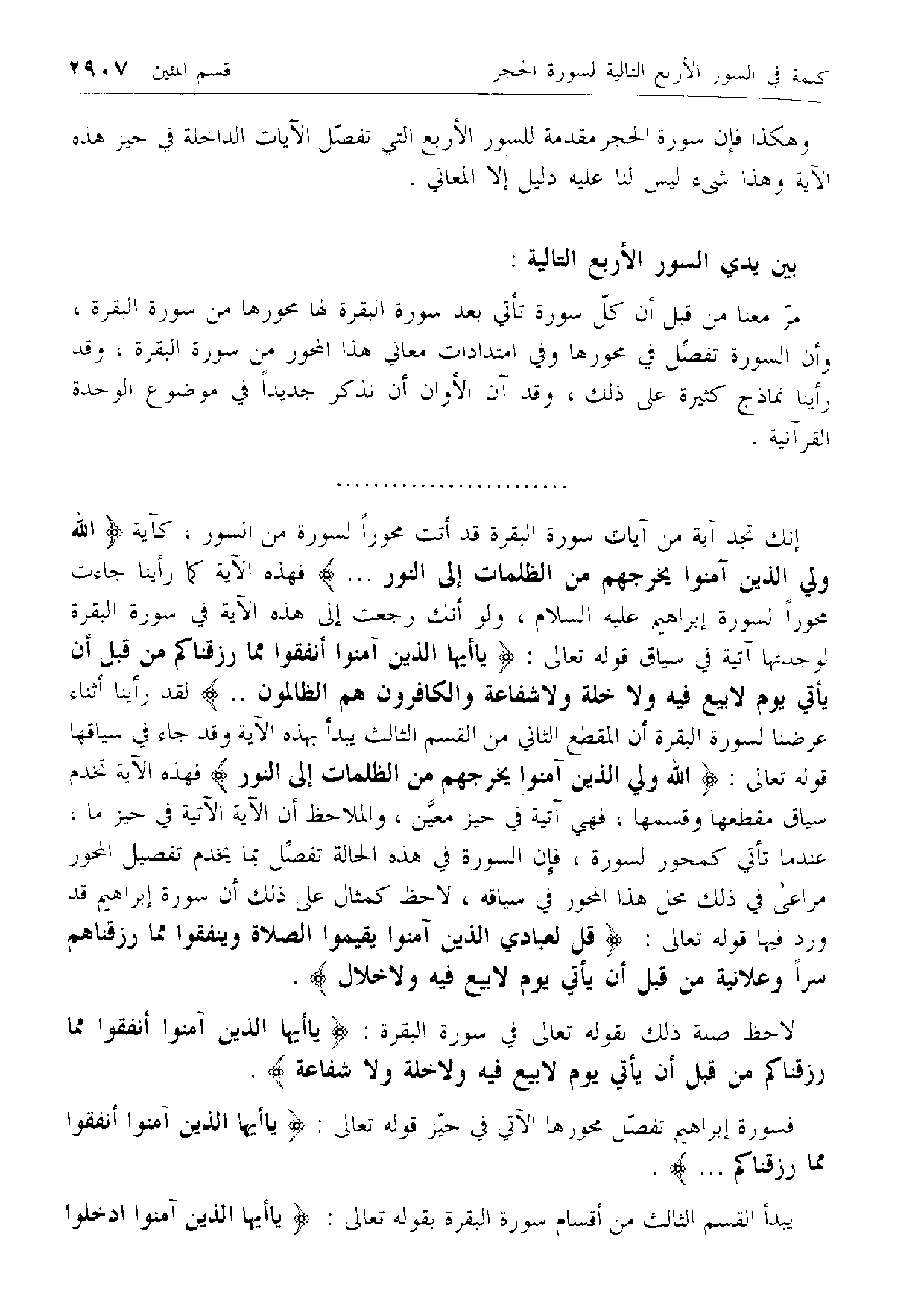 إنك تجد آية من آيات سورة البقرة قد أتت محورا لسورة من السور، كآية اللَّهُ وَلِيُّ الَّذِينَ آمَنُوا يُخْرِجُهُمْ مِنَ الظُّلُماتِ إِلَى النُّورِ ... فهذه الآية كما رأينا جاءت محورا لسورة إبراهيم عليه السلام، ولو أنك رجعت إلى هذه الآية في سورة البقرة لوجدتها آتية في سياق قوله تعالى: يا أَيُّهَا الَّذِينَ آمَنُوا أَنْفِقُوا مِمَّا رَزَقْناكُمْ مِنْ قَبْلِ أَنْ يَأْتِيَ يَوْمٌ لا بَيْعٌ فِيهِ وَلا خُلَّةٌ وَلا شَفاعَةٌ وَالْكافِرُونَ هُمُ الظَّالِمُونَ .. لقد رأينا أثناء عرضنا لسورة البقرة أن المقطع الثاني من القسم الثالث يبدأ بهذه الآية وقد جاء في سياقها قوله تعالى: اللَّهُ وَلِيُّ الَّذِينَ آمَنُوا يُخْرِجُهُمْ مِنَ الظُّلُماتِ إِلَى النُّورِ فهذه الآية تخدم سياق مقطعها وقسمها، فهي آتية في حيز معيّن، والملاحظ أن الآية الآتية في حيز ما، عند ما تأتي كمحور لسورة، فإن السورة في هذه الحالة تفصّل بما يخدم تفصيل المحور مراعى في ذلك محل هذا المحور في سياقه، لاحظ كمثال على ذلك أن سورة إبراهيم قد ورد فيها قوله تعالى: قُلْ لِعِبادِيَ الَّذِينَ آمَنُوا يُقِيمُوا الصَّلاةَ وَيُنْفِقُوا مِمَّا رَزَقْناهُمْ سِرًّا وَعَلانِيَةً مِنْ قَبْلِ أَنْ يَأْتِيَ يَوْمٌ لا بَيْعٌ فِيهِ وَلا خِلالٌ.