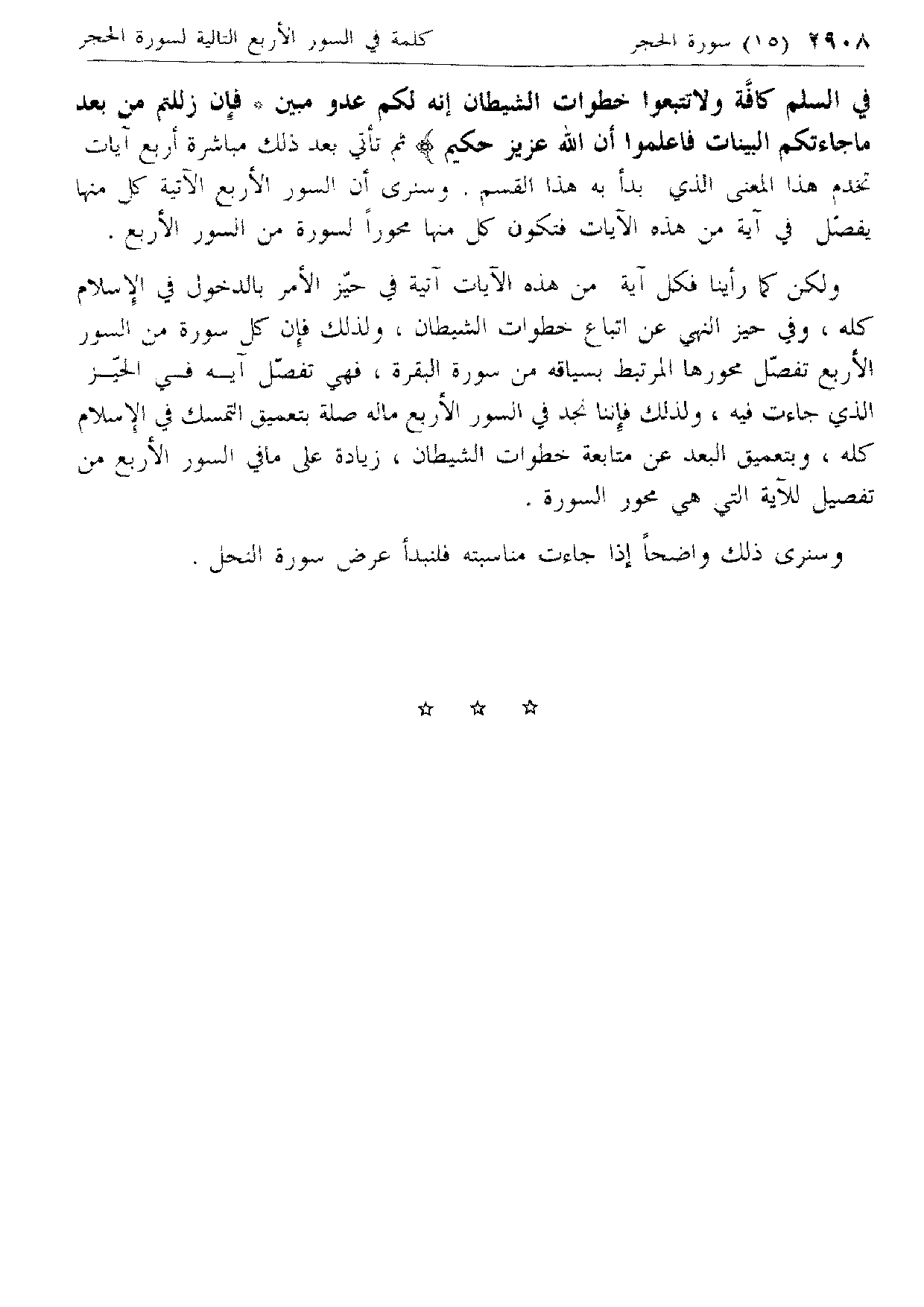 فِي السِّلْمِ كَافَّةً وَلا تَتَّبِعُوا خُطُواتِ الشَّيْطانِ إِنَّهُ لَكُمْ عَدُوٌّ مُبِينٌ* فَإِنْ زَلَلْتُمْ مِنْ بَعْدِ ما جاءَتْكُمُ الْبَيِّناتُ فَاعْلَمُوا أَنَّ اللَّهَ عَزِيزٌ حَكِيمٌ ثم تأتي بعد ذلك مباشرة أربع آيات تخدم هذا المعنى الذي بدأ به هذا القسم. وسنرى أن السور الأربع الآتية كل منها يفصّل في آية من هذه الآيات فتكون كل منها محورا لسورة من السور الأربع.