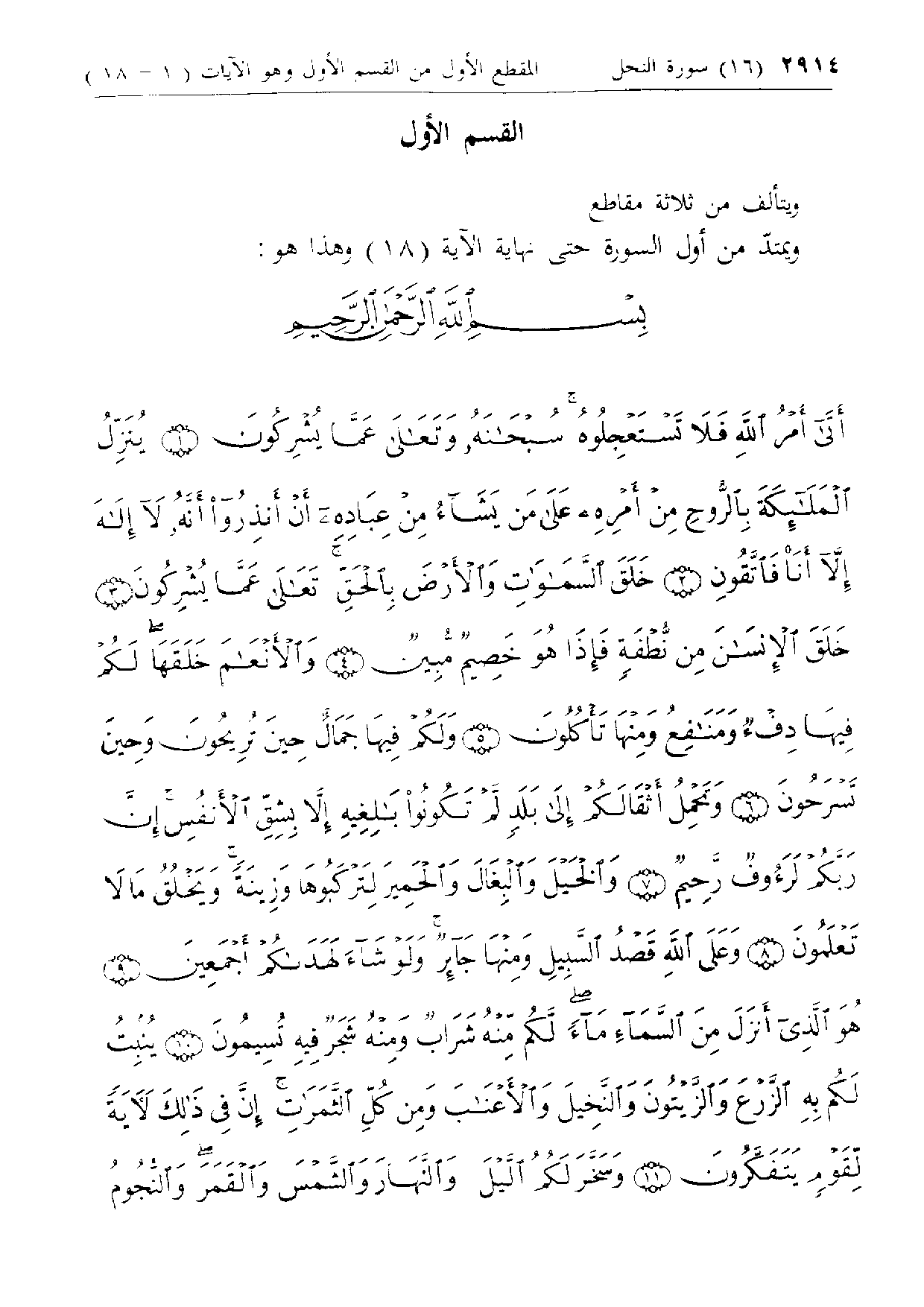 [المقطع الأول من القسم] ويمتدّ من أول السورة حتى نهاية الآية (18) وهذا هو: