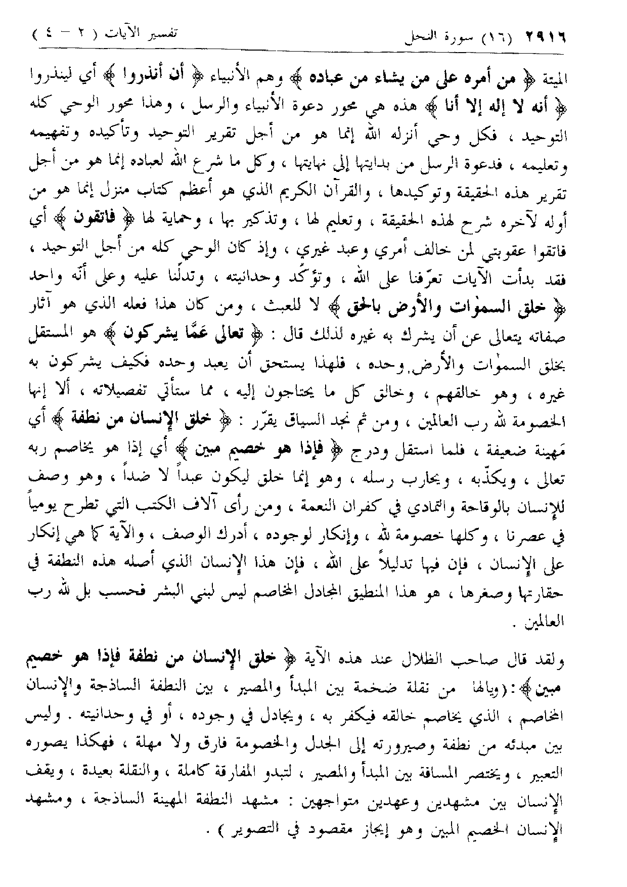 ولقد قال صاحب الظلال عند هذه الآية خَلَقَ الْإِنْسانَ مِنْ نُطْفَةٍ فَإِذا هُوَ خَصِيمٌ مُبِينٌ: (ويا لها من نقلة ضخمة بين المبدأ والمصير، بين النطفة الساذجة والإنسان المخاصم، الذي يخاصم خالقه فيكفر به، ويجادل في وجوده، أو في وحدانيته. وليس بين مبدئه من نطفة وصيرورته إلى الجدل والخصومة فارق ولا مهلة، فهكذا يصوره التعبير، ويختصر المسافة بين المبدأ والمصير، لتبدو المفارقة كاملة، والنقلة بعيدة، ويقف الإنسان بين مشهدين وعهدين متواجهين: مشهد النطفة المهينة الساذجة، ومشهد الإنسان الخصيم المبين وهو إيجاز مقصود في التصوير).