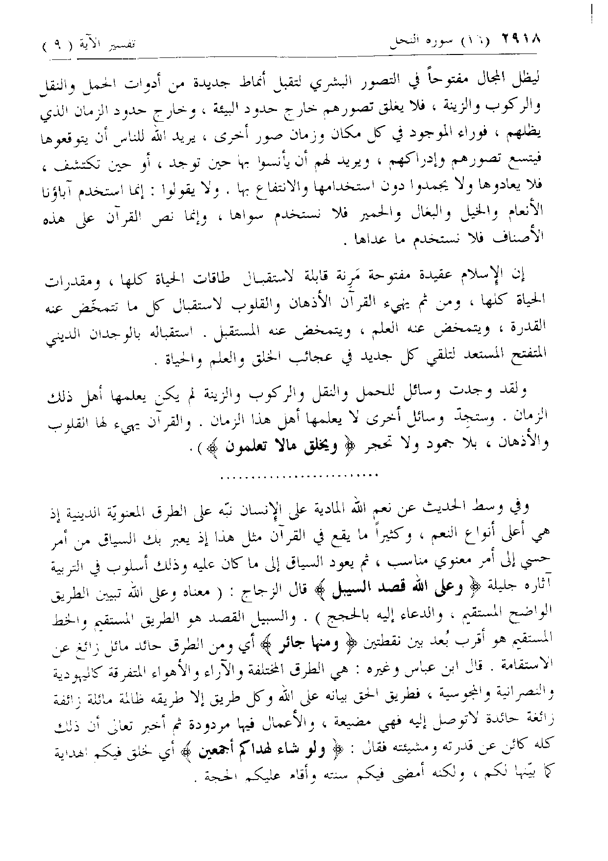 وفي وسط الحديث عن نعم الله المادية على الإنسان نبّه على الطرق المعنويّة الدينية إذ هي أعلى أنواع النعم، وكثيرا ما يقع في القرآن مثل هذا إذ يعبر بك السياق من أمر حسي إلى أمر معنوي مناسب، ثم يعود السياق إلى ما كان عليه وذلك أسلوب في التربية آثاره جليلة وَعَلَى اللَّهِ قَصْدُ السَّبِيلِ قال الزجاج: (معناه وعلى الله تبيين الطريق الواضح المستقيم، والدعاء إليه بالحجج). والسبيل القصد هو الطريق المستقيم والخط المستقيم هو أقرب بعد بين نقطتين وَمِنْها جائِرٌ أي ومن الطرق حائد مائل زائغ عن الاستقامة. قال ابن عباس وغيره: هي الطرق المختلفة والآراء والأهواء المتفرقة كاليهودية والنصرانية والمجوسية، فطريق الحق بيانه على الله وكل طريق إلا طريقه ظالمة مائلة زائفة زائغة حائدة لا توصل إليه فهي مضيعة، والأعمال فيها مردودة ثم أخبر تعالى أن ذلك كله كائن عن قدرته ومشيئته فقال: وَلَوْ شاءَ لَهَداكُمْ أَجْمَعِينَ أي لخلق فيكم الهداية كما بيّنها لكم، ولكنه أمضى فيكم سنته وأقام عليكم الحجة.