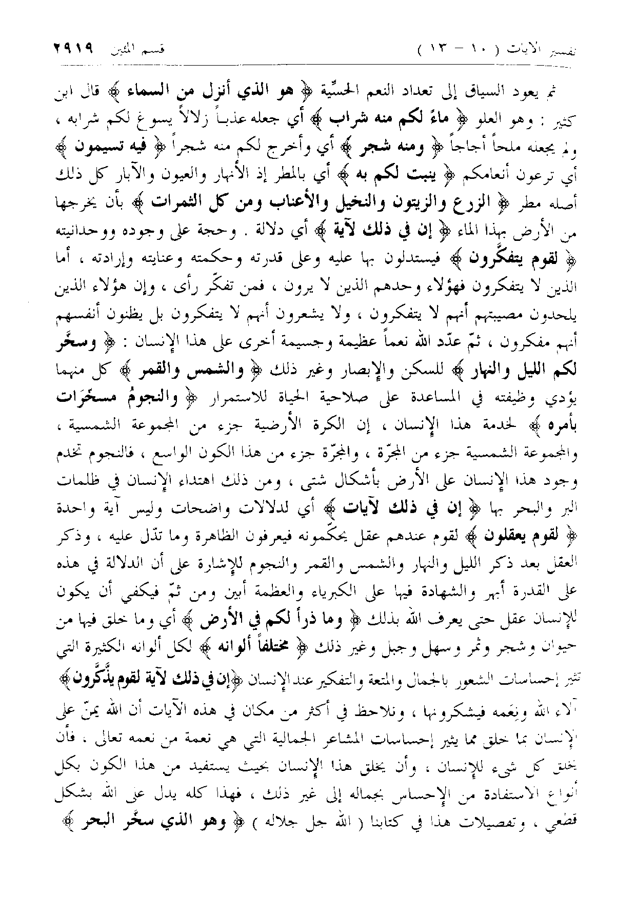 ثم يعود السياق إلى تعداد النعم الحسيّة هُوَ الَّذِي أَنْزَلَ مِنَ السَّماءِ قال ابن كثير: وهو العلو ماءً لَكُمْ مِنْهُ شَرابٌ أي جعله عذبا زلالا يسوغ لكم شرابه، ولم يجعله ملحا أجاجا وَمِنْهُ شَجَرٌ أي وأخرج لكم منه شجرا فِيهِ تُسِيمُونَ أي ترعون أنعامكم