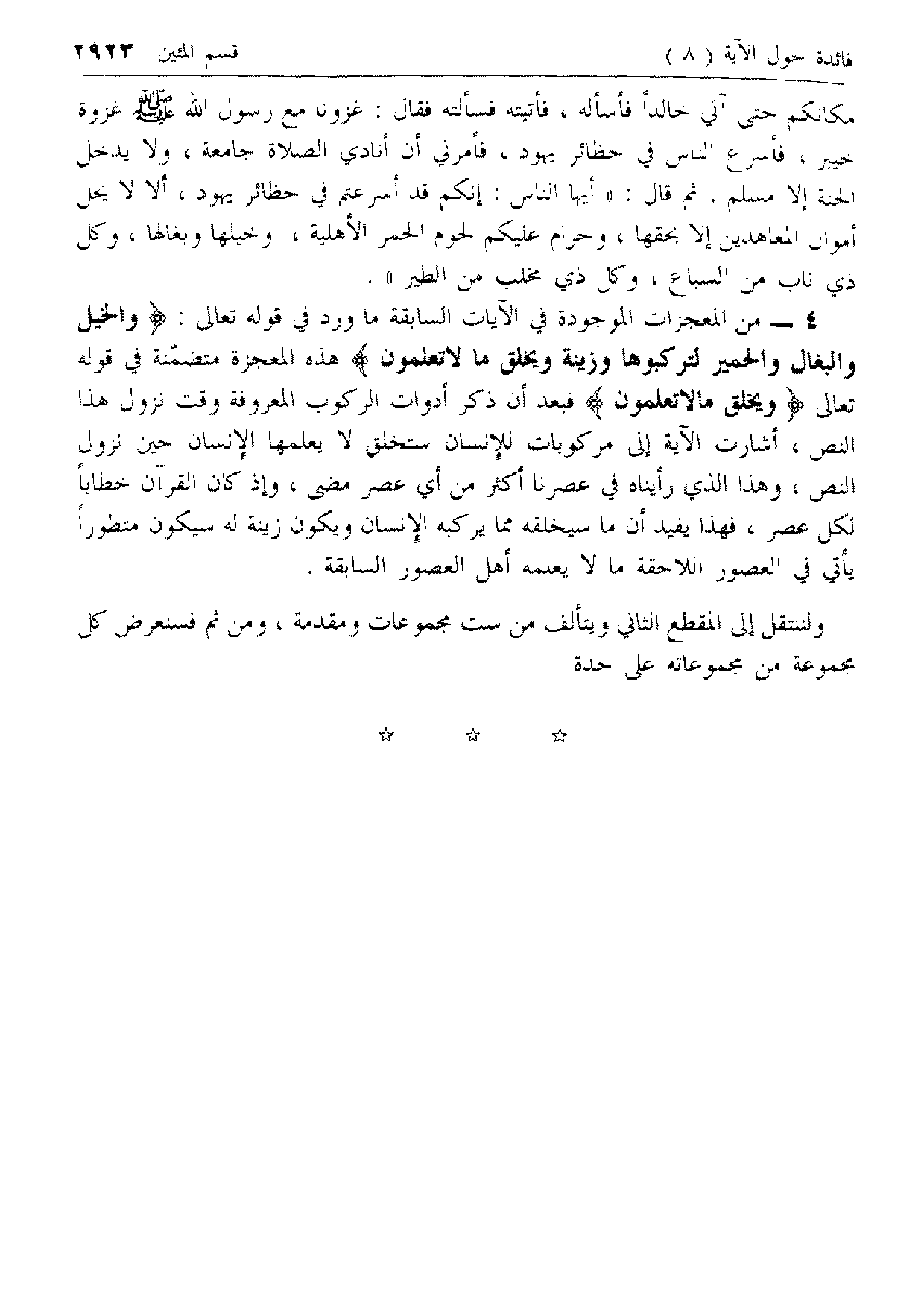 من المعجزات الموجودة في الآيات السابقة ما ورد في قوله تعالى: وَالْخَيْلَ وَالْبِغالَ وَالْحَمِيرَ لِتَرْكَبُوها وَزِينَةً وَيَخْلُقُ ما لا تَعْلَمُونَ هذه المعجزة متضمّنة في قوله تعالى وَيَخْلُقُ ما لا تَعْلَمُونَ فبعد أن ذكر أدوات الركوب المعروفة وقت نزول هذا النص، أشارت الآية إلى مركوبات للإنسان ستخلق لا يعلمها الإنسان حين نزول النص، وهذا الذي رأيناه في عصرنا أكثر من أي عصر مضى، وإذ كان القرآن خطابا لكل عصر، فهذا يفيد أن ما سيخلقه مما يركبه الإنسان ويكون زينة له سيكون متطورا يأتي في العصور اللاحقة ما لا يعلمه أهل العصور السابقة.