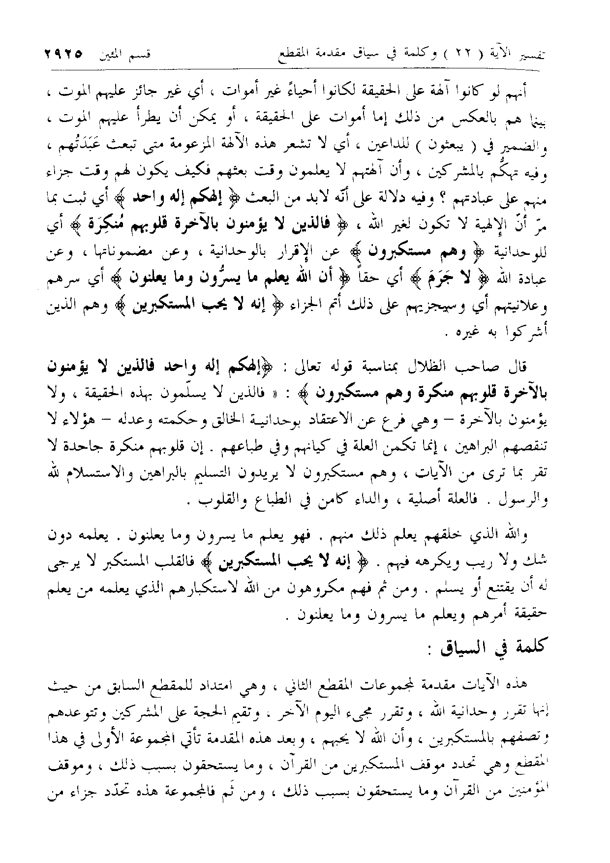 قال صاحب الظلال بمناسبة قوله تعالى: إِلهُكُمْ إِلهٌ واحِدٌ فَالَّذِينَ لا يُؤْمِنُونَ بِالْآخِرَةِ قُلُوبُهُمْ مُنْكِرَةٌ وَهُمْ مُسْتَكْبِرُونَ: «فالذين لا يسلّمون بهذه الحقيقة، ولا يؤمنون بالآخرة- وهي فرع عن الاعتقاد بوحدانية الخالق وحكمته وعدله- هؤلاء لا تنقصهم البراهين، إنما تكمن العلة في كيانهم وفي طباعهم. إن قلوبهم منكرة جاحدة لا تقر