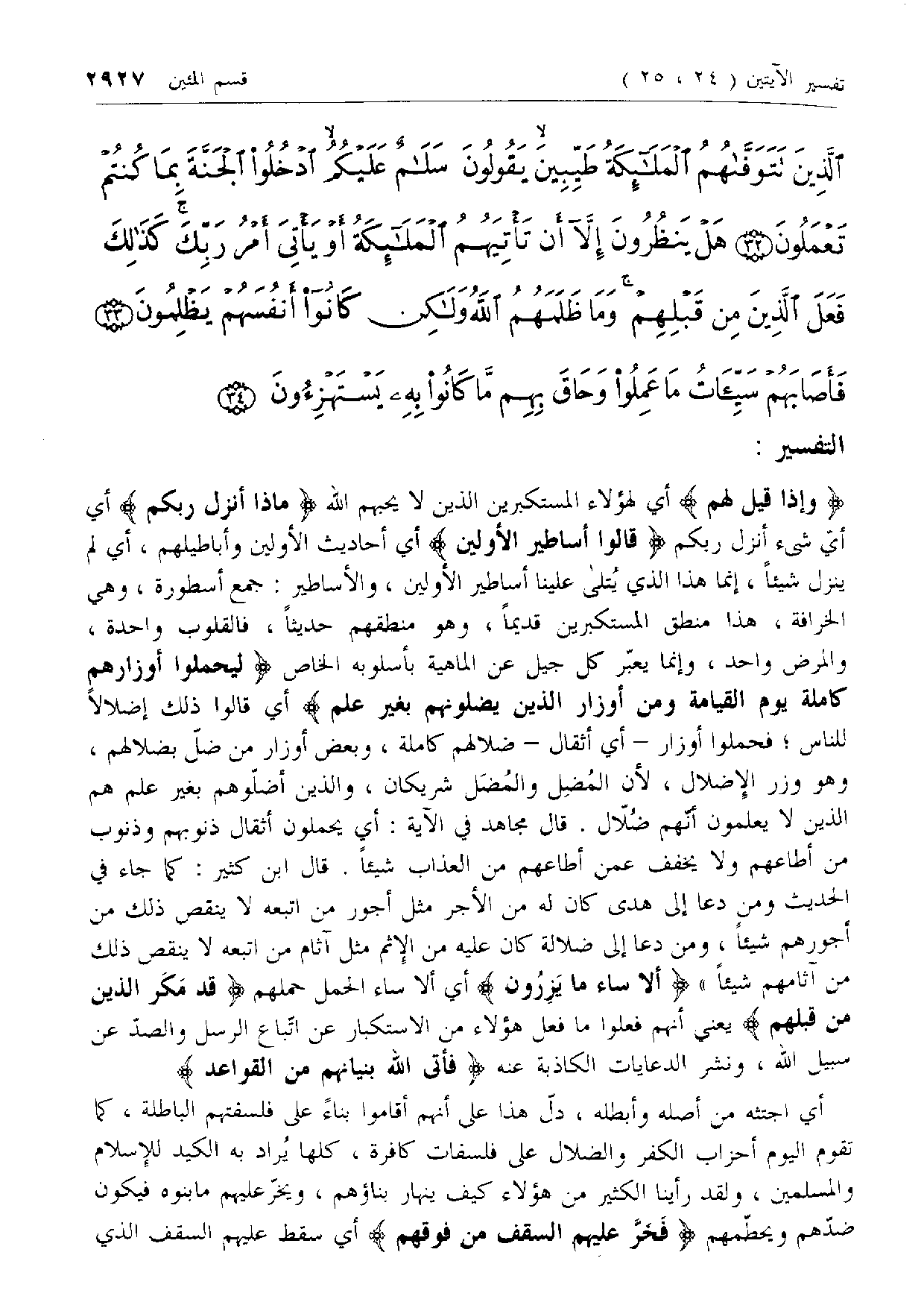 وَإِذا قِيلَ لَهُمْ أي لهؤلاء المستكبرين الذين لا يحبهم الله ماذا أَنْزَلَ رَبُّكُمْ أي أيّ شئ أنزل ربكم قالُوا أَساطِيرُ الْأَوَّلِينَ أي أحاديث الأولين وأباطيلهم، أي لم ينزل شيئا، إنما هذا الذي يتلى علينا أساطير الأولين، والأساطير: جمع أسطورة، وهي الخرافة، هذا منطق المستكبرين قديما، وهو منطقهم حديثا، فالقلوب واحدة، والمرض واحد، وإنما يعبّر كل جيل عن الماهية بأسلوبه الخاص