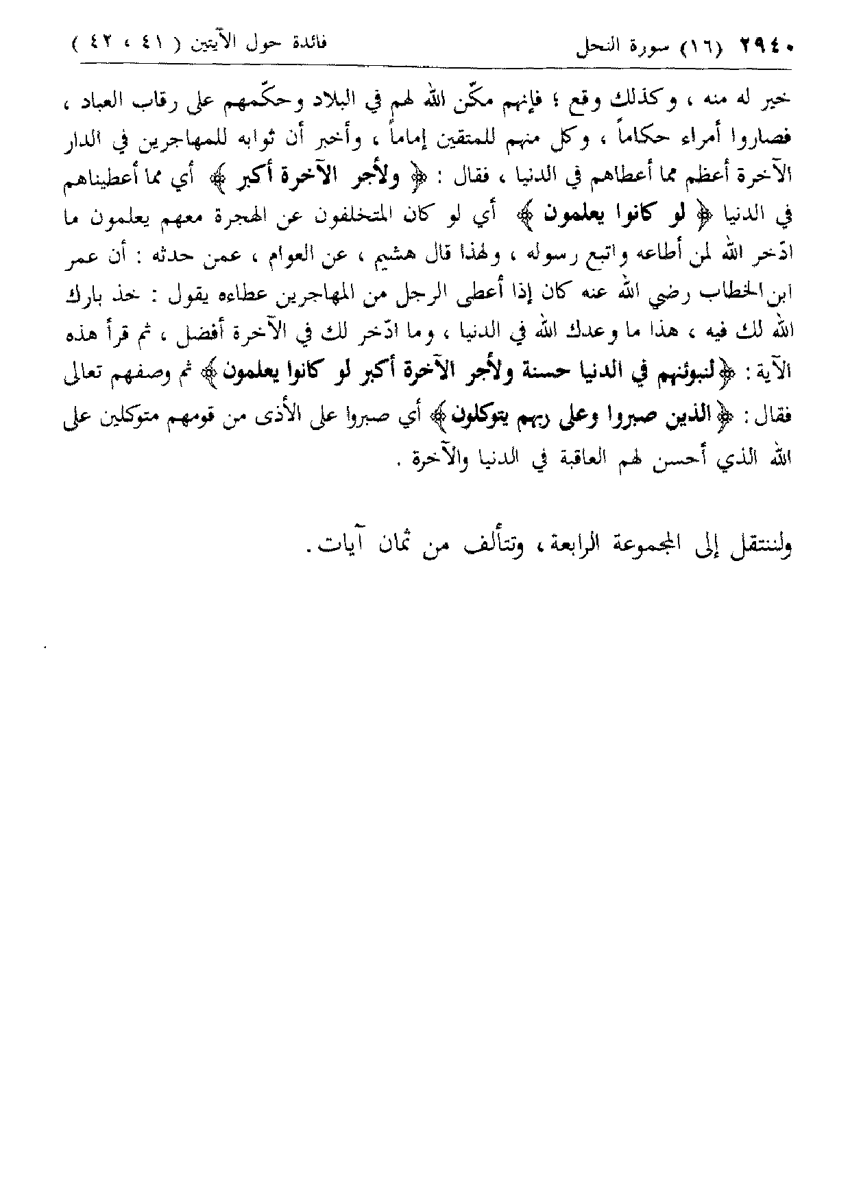خير له منه، وكذلك وقع؛ فإنهم مكّن الله لهم في البلاد وحكّمهم على رقاب العباد، فصاروا أمراء حكاما، وكل منهم للمتقين إماما، وأخبر أن ثوابه للمهاجرين في الدار الآخرة أعظم مما أعطاهم في الدنيا، فقال: وَلَأَجْرُ الْآخِرَةِ أَكْبَرُ أي مما أعطيناهم في الدنيا لَوْ كانُوا يَعْلَمُونَ أي لو كان المتخلفون عن الهجرة معهم يعلمون ما ادّخر الله لمن أطاعه واتبع رسوله، ولهذا قال هشيم، عن العوام، عمن حدثه: أن عمر ابن الخطاب رضي الله عنه كان إذا أعطى الرجل من المهاجرين عطاءه يقول: خذ بارك الله لك فيه، هذا ما وعدك الله في الدنيا، وما ادّخر لك في الآخرة أفضل، ثم قرأ هذه الآية: لَنُبَوِّئَنَّهُمْ فِي الدُّنْيا حَسَنَةً وَلَأَجْرُ الْآخِرَةِ أَكْبَرُ لَوْ كانُوا يَعْلَمُونَ ثم وصفهم تعالى فقال: الَّذِينَ صَبَرُوا وَعَلى رَبِّهِمْ يَتَوَكَّلُونَ أي صبروا على الأذى من قومهم متوكلين على الله الذي أحسن لهم العاقبة في الدنيا والآخرة.