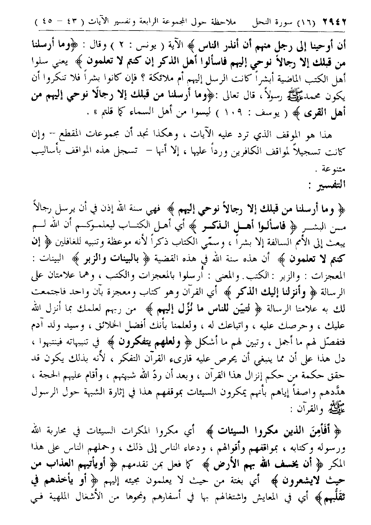 المعجزات: والزبر: الكتب. والمعنى: أرسلوا بالمعجزات والكتب، وهما علامتان على الرسالة وَأَنْزَلْنا إِلَيْكَ الذِّكْرَ أي القرآن وهو كتاب ومعجزة بآن واحد فاجتمعت لك به علامتا الرسالة لِتُبَيِّنَ لِلنَّاسِ ما نُزِّلَ إِلَيْهِمْ من ربهم لعلمك بما أنزل الله عليك، وحرصك عليه، واتباعك له، ولعلمنا بأنك أفضل الخلائق، وسيد ولد آدم فتفصّل لهم ما أجمل، وتبين لهم ما أشكل وَلَعَلَّهُمْ يَتَفَكَّرُونَ في تنبيهاته فينتبهوا، دل هذا على أن مما ينبغي أن يحرص عليه قارئ القرآن التفكر، لأنه بذلك يكون قد حقق حكمة من حكم إنزال هذا القرآن، وبعد أن ردّ الله شبهتهم، وأقام عليهم الحجة، هدّدهم واصفا إياهم بأنهم يمكرون السيئات بموقفهم هذا في إثارة الشبهة حول الرسول صلّى الله عليه وسلّم والقرآن: