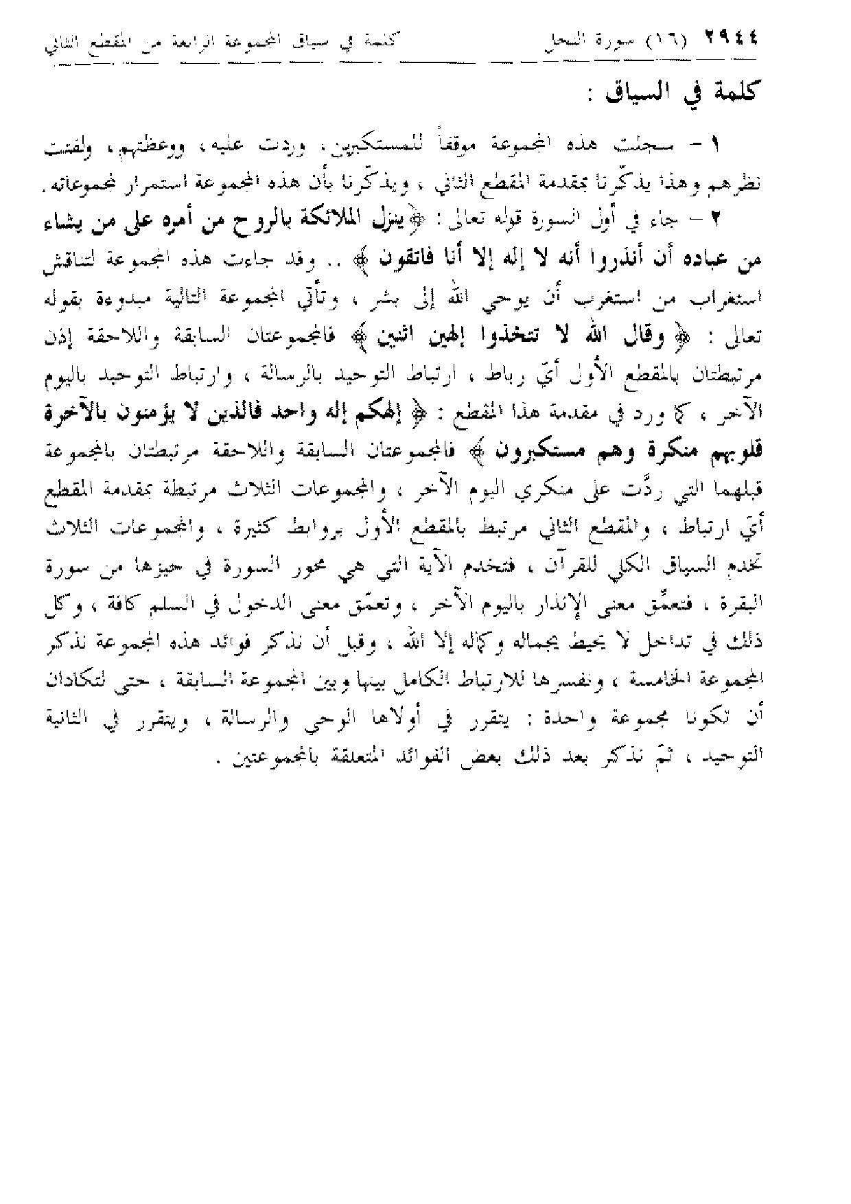 2 - جاء في أول السورة قوله تعالى: يُنَزِّلُ الْمَلائِكَةَ بِالرُّوحِ مِنْ أَمْرِهِ عَلى مَنْ يَشاءُ مِنْ عِبادِهِ أَنْ أَنْذِرُوا أَنَّهُ لا إِلهَ إِلَّا أَنَا فَاتَّقُونِ. .. وقد جاءت هذه المجموعة لتناقش استغراب من استغرب أن يوحي الله إلى بشر، وتأتي المجموعة التالية مبدوءة بقوله تعالى: وَقالَ اللَّهُ لا تَتَّخِذُوا إِلهَيْنِ اثْنَيْنِ فالمجموعتان السابقة واللاحقة إذن مرتبطتان بالمقطع الأول أيّ رباط، ارتباط التوحيد بالرسالة، وارتباط التوحيد باليوم الآخر، كما ورد في مقدمة هذا المقطع: إِلهُكُمْ إِلهٌ واحِدٌ فَالَّذِينَ لا يُؤْمِنُونَ بِالْآخِرَةِ قُلُوبُهُمْ مُنْكِرَةٌ وَهُمْ مُسْتَكْبِرُونَ فالمجموعتان السابقة واللاحقة مرتبطتان بالمجموعة قبلهما التي ردّت على منكري اليوم الآخر، والمجموعات الثلاث مرتبطة بمقدمة المقطع أيّ ارتباط، والمقطع الثاني مرتبط بالمقطع الأول بروابط كثيرة، والمجموعات الثلاث تخدم السياق الكلي للقرآن، فتخدم الآية التي هي محور السورة في حيزها من سورة البقرة، فتعمّق معنى الإنذار باليوم الآخر، وتعمّق معنى الدخول في السلم كافة، وكل ذلك في تداخل لا يحيط بجماله وكماله إلا الله، وقبل أن نذكر فوائد هذه المجموعة نذكر المجموعة الخامسة، ونفسرها للارتباط الكامل بينها وبين المجموعة السابقة، حتى لتكادان أن تكونا مجموعة واحدة: يتقرر في أولاها الوحي والرسالة، ويتقرر في الثانية التوحيد، ثمّ نذكر بعد ذلك بعض الفوائد المتعلقة بالمجموعتين.