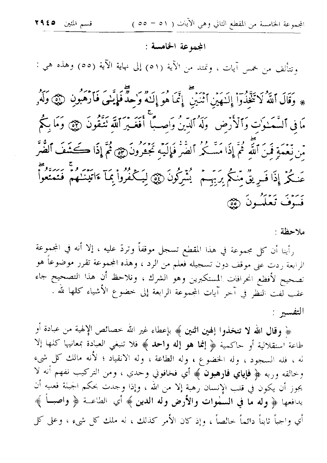 المجموعة الخامسة: وتتألف من خمس آيات، وتمتد من الآية (51) إلى نهاية الآية (55) وهذه هي: