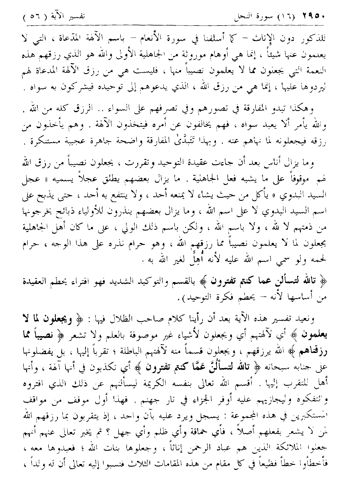 ونعيد تفسير هذه الآية بعد أن رأينا كلام صاحب الظلال فيها: وَيَجْعَلُونَ لِما لا يَعْلَمُونَ أي لآلهتهم أي ويجعلون لأشياء غير موصوفة بالعلم ولا تشعر نَصِيباً مِمَّا رَزَقْناهُمْ الله يرزقهم، ويجعلون قسما منه لآلهتهم الباطلة؛ تقربا إليها، بل يفضلونها على جنابه سبحانه تَاللَّهِ لَتُسْئَلُنَّ عَمَّا كُنْتُمْ تَفْتَرُونَ أي تكذبون في أنها آلهة، وأنها أهل للتقرب إليها. أقسم الله تعالى بنفسه الكريمة ليسألنهم عن ذلك الذي افتروه وائتفكوه وليجازيهم عليه أوفر الجزاء في نار جهنم. فهذا أول موقف من مواقف المستكبرين في هذه المجموعة: يسجل ويرد عليه بآن واحد، إذ يتقربون بما رزقهم الله لمن لا يشعر بفعلهم أصلا، فأي حماقة وأي ظلم وأي جهل؟ ثم يخبر تعالى عنهم أنهم جعلوا الملائكة الذين هم عباد الرحمن إناثا، وجعلوها بنات الله؛ فعبدوها معه، فأخطئوا خطأ فظيعا في كل مقام من هذه المقامات الثلاث فنسبوا إليه تعالى أن له ولدا،