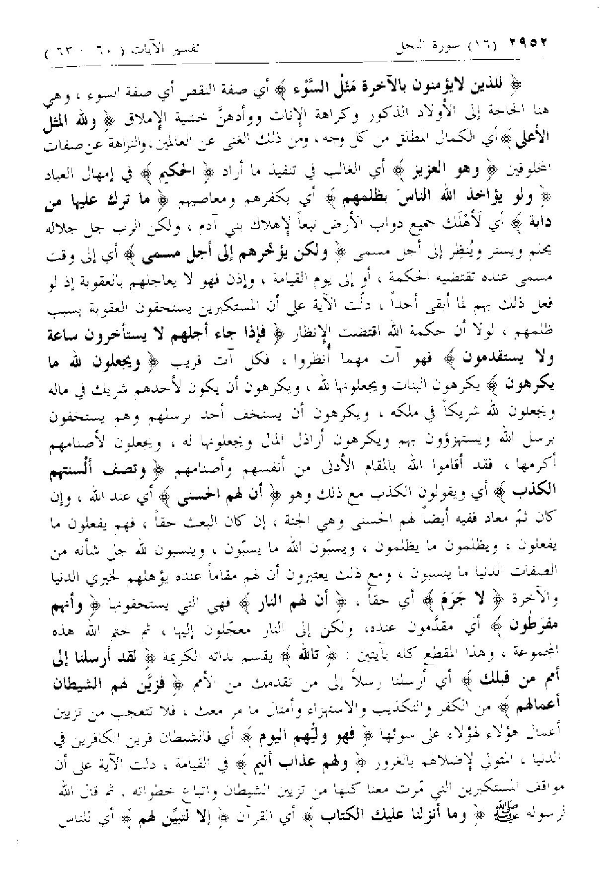 لِلَّذِينَ لا يُؤْمِنُونَ بِالْآخِرَةِ مَثَلُ السَّوْءِ أي صفة النقص أي صفة السوء، وهي هنا الحاجة إلى الأولاد الذكور وكراهة الإناث ووأدهنّ خشية الإملاق وَلِلَّهِ الْمَثَلُ الْأَعْلى أي الكمال المطلق من كل وجه، ومن ذلك الغنى عن العالمين، والنزاهة عن صفات المخلوقين وَهُوَ الْعَزِيزُ أي الغالب في تنفيذ ما أراد الْحَكِيمُ في إمهال العباد