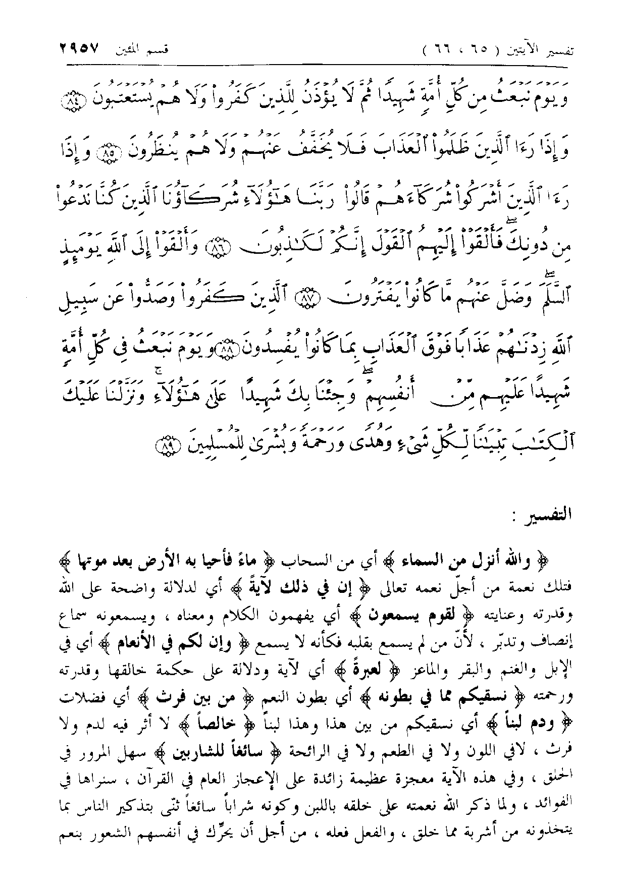 وَإِنَّ لَكُمْ فِي الْأَنْعامِ أي في الإبل والغنم والبقر والماعز لَعِبْرَةً أي لآية ودلالة على حكمة خالقها وقدرته ورحمته نُسْقِيكُمْ مِمَّا فِي بُطُونِهِ أي بطون النعم مِنْ بَيْنِ فَرْثٍ أي فضلات وَدَمٍ لَبَناً أي نسقيكم من بين هذا وهذا لبنا خالِصاً لا أثر فيه لدم ولا فرث، لا في اللون ولا في الطعم ولا في الرائحة سائِغاً لِلشَّارِبِينَ سهل المرور في الحلق، وفي هذه الآية معجزة عظيمة زائدة على الإعجاز العام في القرآن، سنراها في الفوائد، ولما ذكر الله نعمته على خلقه باللبن وكونه شرابا سائغا ثنّى بتذكير الناس بما يتخذونه من أشربة مما خلق، والفعل فعله، من أجل أن يحرّك في أنفسهم الشعور بنعم