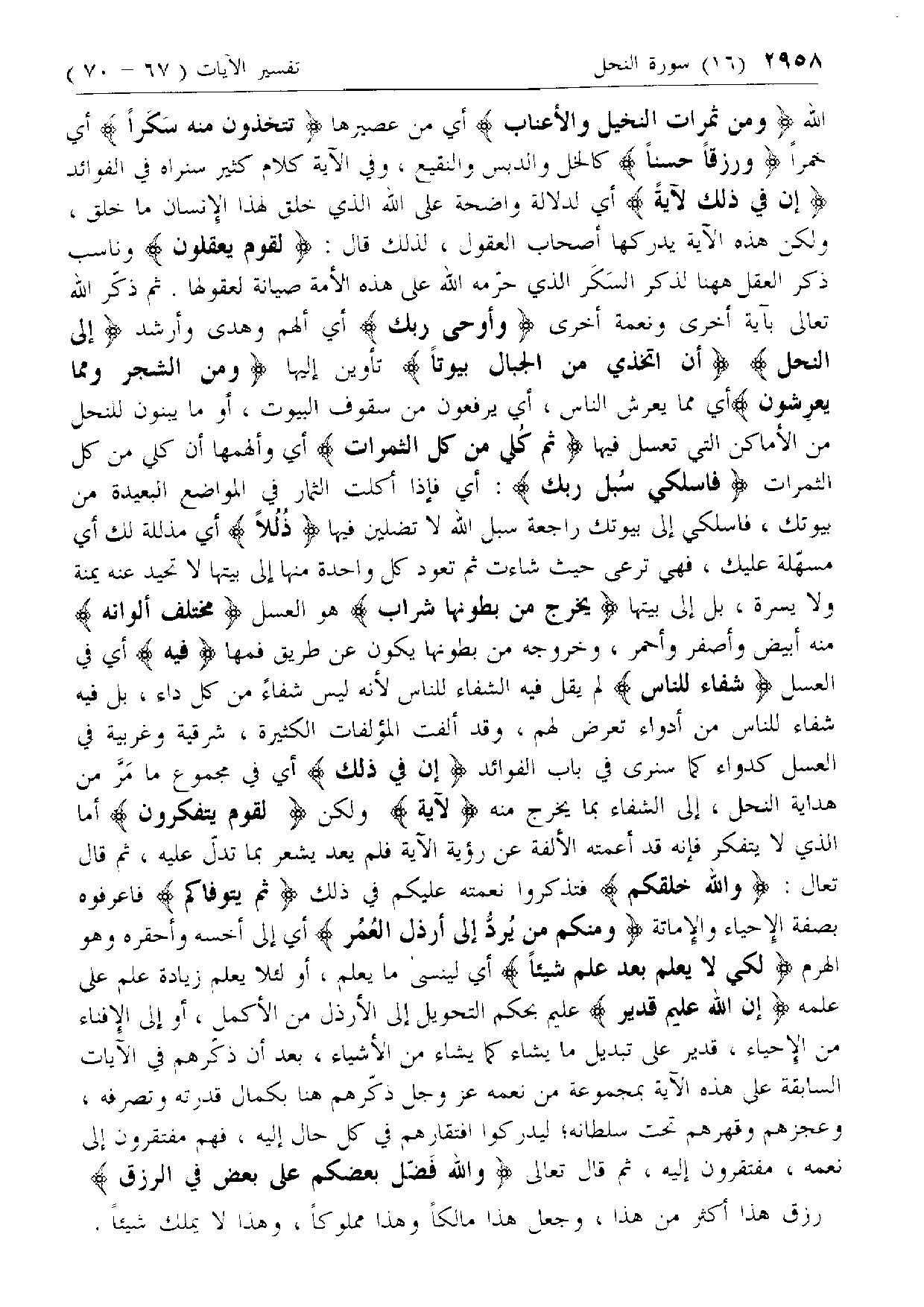 ثُمَّ كُلِي مِنْ كُلِّ الثَّمَراتِ أي وألهمها أن كلي من كل الثمرات فَاسْلُكِي سُبُلَ رَبِّكِ: أي فإذا أكلت الثمار في المواضع البعيدة من بيوتك، فاسلكي إلى بيوتك راجعة سبل الله لا تضلين فيها ذُلُلًا أي مذللة لك أي مسهّلة عليك، فهي ترعى حيث شاءت ثم تعود كل واحدة منها إلى بيتها لا تحيد عنه يمنة ولا يسرة، بل إلى بيتها يَخْرُجُ مِنْ بُطُونِها شَرابٌ هو العسل مُخْتَلِفٌ أَلْوانُهُ منه أبيض وأصفر وأحمر، وخروجه من بطونها يكون عن طريق فمها فِيهِ أي في العسل شِفاءٌ لِلنَّاسِ لم يقل فيه الشفاء للناس لأنه ليس شفاء من كل داء، بل فيه شفاء للناس من أدواء تعرض لهم، وقد ألفت المؤلفات الكثيرة، شرقية وغربية في العسل كدواء كما سنرى في باب الفوائد إِنَّ فِي ذلِكَ أي في مجموع ما مرّ من هداية النحل، إلى الشفاء بما يخرج منه لَآيَةً ولكن لِقَوْمٍ يَتَفَكَّرُونَ أما الذي لا يتفكر فإنه قد أعمته الألفة عن رؤية الآية فلم يعد يشعر بما تدلّ عليه، ثم قال تعال: