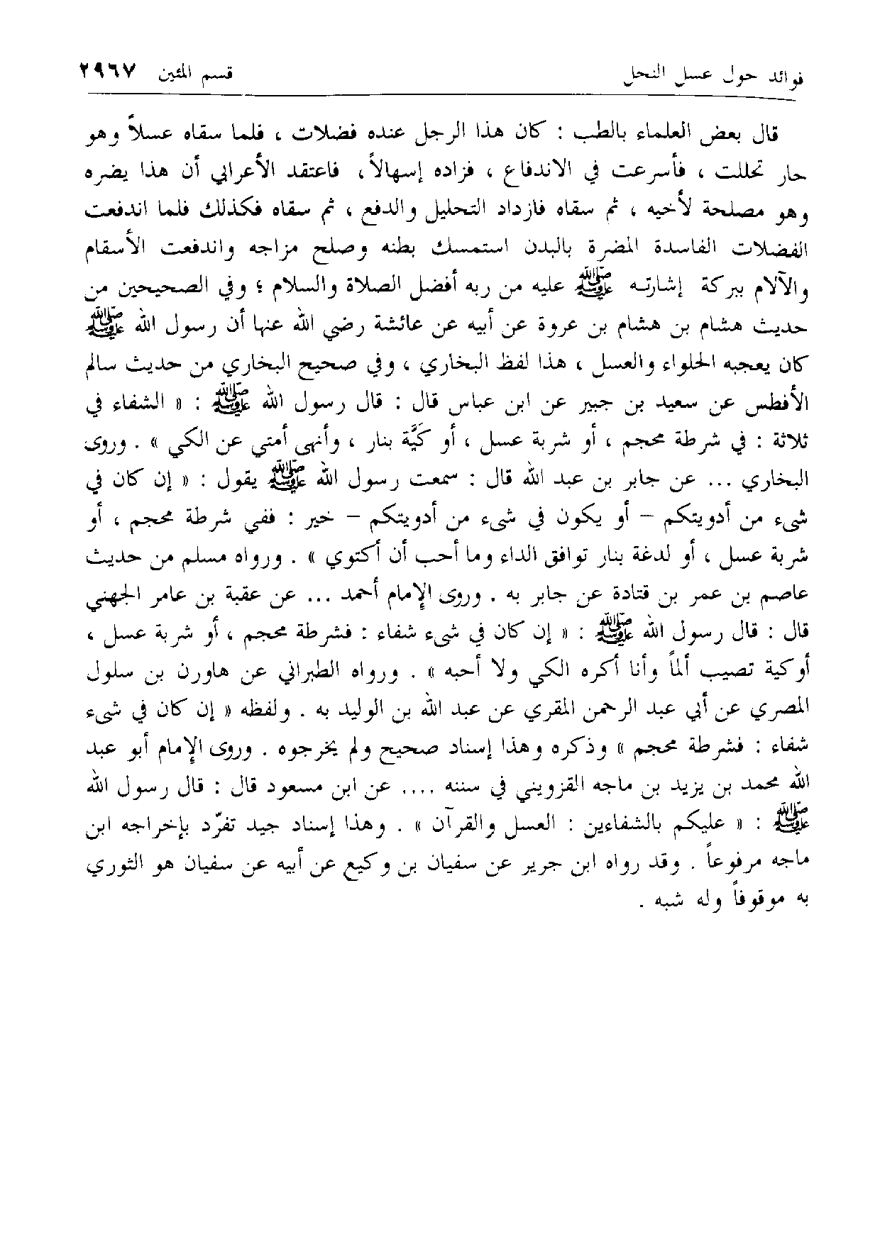 قال بعض العلماء بالطب: كان هذا الرجل عنده فضلات، فلما سقاه عسلا وهو حار تحللت، فأسرعت في الاندفاع، فزاده إسهالا، فاعتقد الأعرابي أن هذا يضره وهو مصلحة لأخيه، ثم سقاه فازداد التحليل والدفع، ثم سقاه فكذلك فلما اندفعت الفضلات الفاسدة المضرة بالبدن استمسك بطنه وصلح مزاجه واندفعت الأسقام والآلام ببركة إشارته صلّى الله عليه وسلّم عليه من ربه أفضل الصلاة والسلام؛ وفي الصحيحين من حديث هشام بن هشام بن عروة عن أبيه عن عائشة رضي الله عنها أن رسول الله صلّى الله عليه وسلّم كان يعجبه الحلواء والعسل، هذا لفظ البخاري، وفي صحيح البخاري من حديث سالم الأفطس عن سعيد بن جبير عن ابن عباس قال: قال رسول الله صلّى الله عليه وسلّم: «الشفاء في ثلاثة: في شرطة محجم، أو شربة عسل، أو كيّة بنار، وأنهى أمتي عن الكي». وروى البخاري ... عن جابر بن عبد الله قال: سمعت رسول الله صلّى الله عليه وسلّم يقول: «إن كان في شئ من أدويتكم- أو يكون في شئ من أدويتكم- خير: ففي شرطة محجم، أو شربة عسل، أو لدغة بنار توافق الداء وما أحب أن أكتوي». ورواه مسلم من حديث عاصم بن عمر بن قتادة عن جابر به. وروى الإمام أحمد ... عن عقبة بن عامر الجهني قال: قال رسول الله صلّى الله عليه وسلّم: «إن كان في شئ شفاء: فشرطة محجم، أو شربة عسل، أو كية تصيب ألما وأنا أكره الكي ولا أحبه». ورواه الطبراني عن هارون بن سلول المصري عن أبي عبد الرحمن المقري عن عبد الله بن الوليد به. ولفظه «إن كان في شئ شفاء: فشرطة محجم» وذكره وهذا إسناد صحيح ولم يخرجوه. وروى الإمام أبو عبد الله محمد بن يزيد بن ماجه القزويني في سننه .... عن ابن مسعود قال: قال رسول الله صلّى الله عليه وسلّم: «عليكم بالشفاءين: العسل والقرآن». وهذا إسناد جيد تفرّد بإخراجه ابن ماجه مرفوعا. وقد رواه ابن جرير عن سفيان بن وكيع عن أبيه عن سفيان هو الثوري به موقوفا وله شبه.