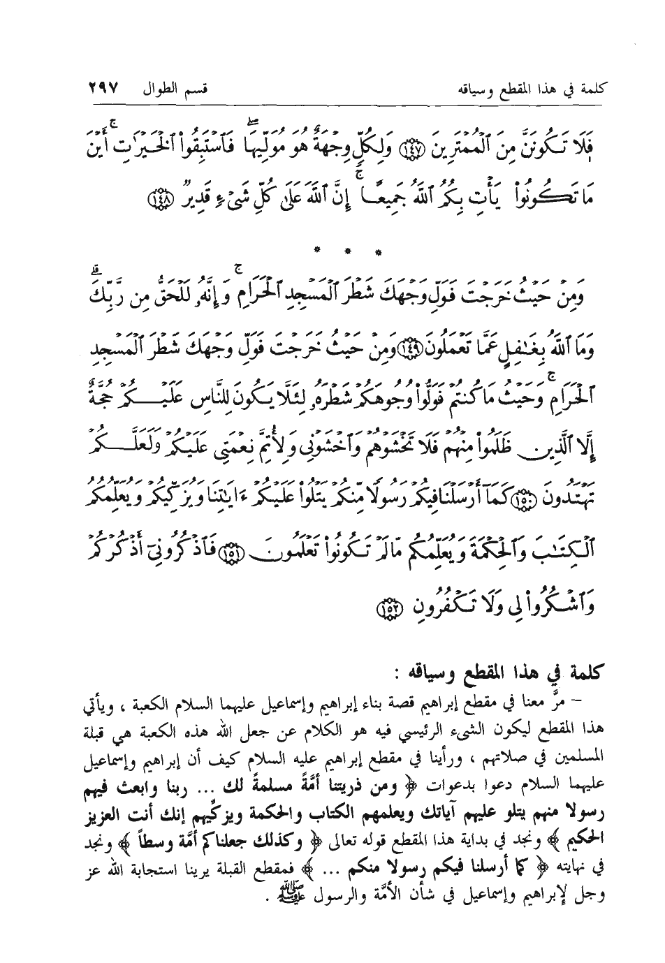 - مر معنا في مقطع إبراهيم قصة بناء إبراهيم وإسماعيل عليهما السلام الكعبة، ويأتي هذا المقطع ليكون الشئ الرئيسي فيه هو الكلام عن جعل الله هذه الكعبة هي قبلة المسلمين في صلاتهم، ورأينا في مقطع إبراهيم عليه السلام كيف أن إبراهيم وإسماعيل عليهما السلام دعوا بدعوات وَمِنْ ذُرِّيَّتِنا أُمَّةً مُسْلِمَةً لَكَ ... رَبَّنا وَابْعَثْ فِيهِمْ رَسُولًا مِنْهُمْ يَتْلُوا عَلَيْهِمْ آياتِكَ وَيُعَلِّمُهُمُ الْكِتابَ وَالْحِكْمَةَ وَيُزَكِّيهِمْ إِنَّكَ أَنْتَ الْعَزِيزُ الْحَكِيمُ ونجد في بداية هذا المقطع قوله تعالى وَكَذلِكَ جَعَلْناكُمْ أُمَّةً وَسَطاً ونجد في نهايته كَما أَرْسَلْنا فِيكُمْ رَسُولًا مِنْكُمْ ... فمقطع القبلة يرينا استجابة الله عزّ وجل لإبراهيم وإسماعيل في شأن الأمة والرسول صلى الله عليه وسلم.