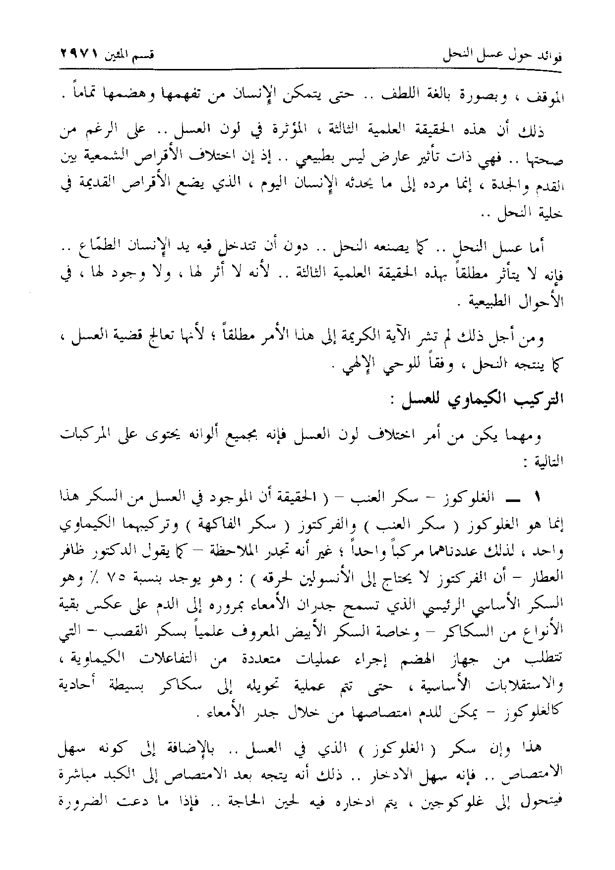 1 - الغلوكوز- سكر العنب- (الحقيقة أن الموجود في العسل من السكر هذا إنما هو الغلوكوز (سكر العنب) والفروكتوز (سكر الفاكهة) وتركيبهما الكيماوي واحد، لذلك عددناهما مركبا واحدا؛ غير أنه تجدر الملاحظة- كما يقول الدكتور ظافر العطار- أن الفروكتوز لا يحتاج إلى الأنسولين لحرقه): وهو يوجد بنسبة 75% وهو السكر الأساسي الرئيسي الذي تسمح جدران الأمعاء بمروره إلى الدم على عكس بقية الأنواع من السكاكر- وخاصة السكر الأبيض المعروف علميا بسكر القصب- التي تتطلب من جهاز الهضم إجراء عمليات متعددة من التفاعلات الكيماوية، والاستقلابات الأساسية، حتى تتم عملية تحويله إلى سكاكر بسيطة أحادية كالغلوكوز- يمكن للدم امتصاصها من خلال جدر الأمعاء.