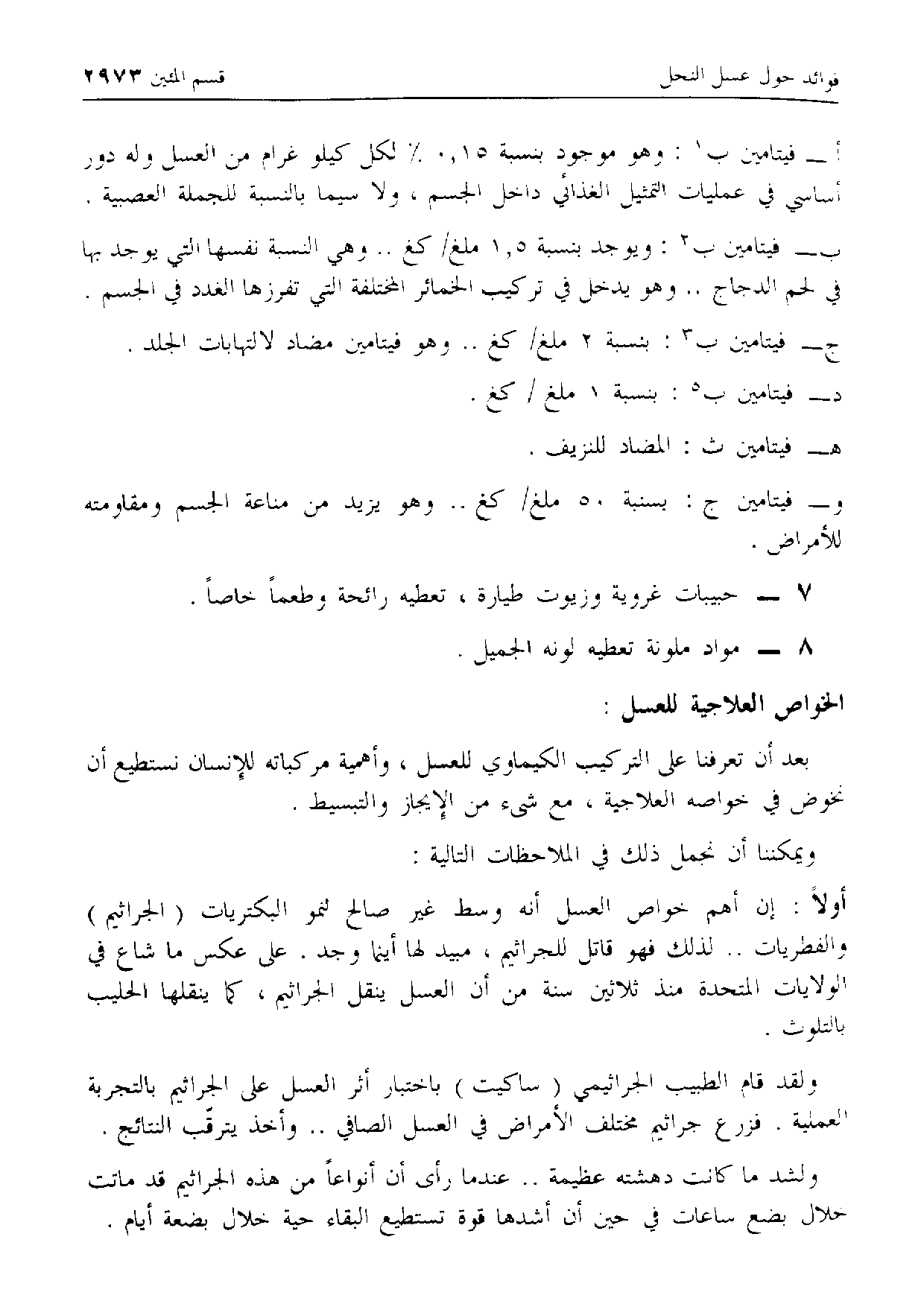 لذلك فهو قاتل للجراثيم، مبيد لها أينما وجد. على عكس ما شاع في الولايات المتحدة منذ ثلاثين سنة من أن العسل ينقل الجراثيم، كما ينقلها الحليب بالتلوث.