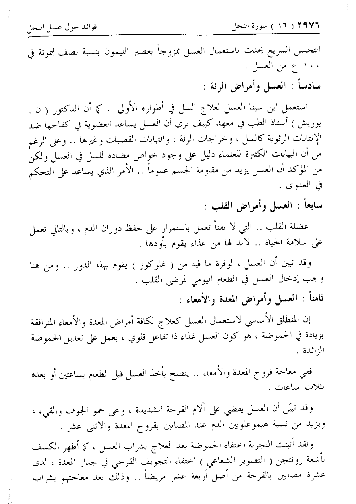 وقد تبيّن أن العسل يقضي على آلام القرحة الشديدة، وعلى حمو الجوف والقيء، ويزيد من نسبة هيموغلوبين الدم عند المصابين بقروح المعدة والاثنى عشر.