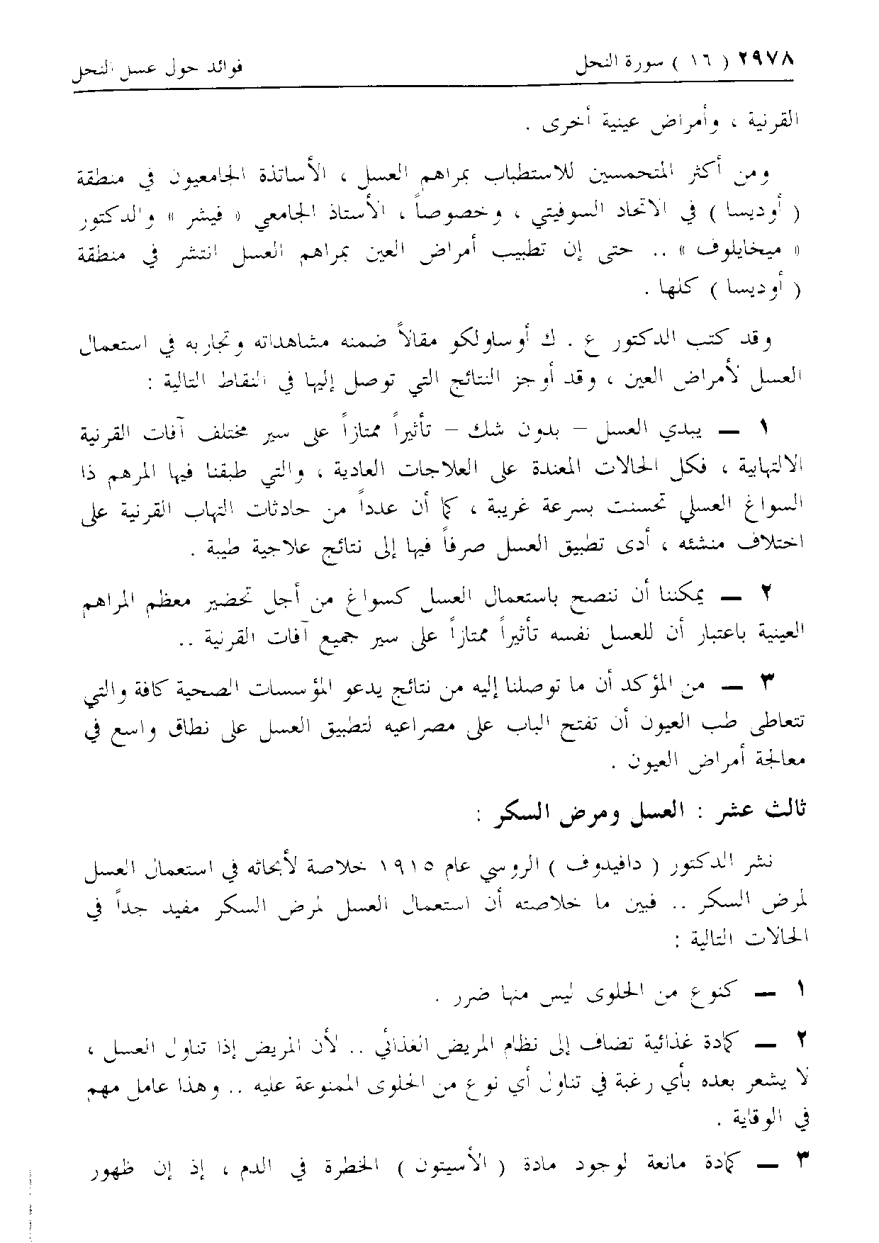 نشر الدكتور (دافيدوف) الروسي عام 1915 خلاصة لأبحاثه في استعمال العسل لمرض السكر .. فبين ما خلاصته أن استعمال العسل لمرض السكر مفيد جدا في الحالات التالية: