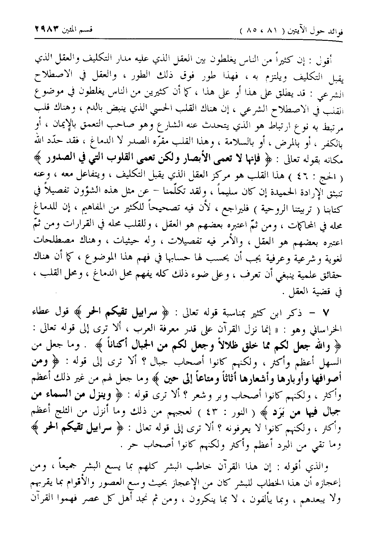 أقول: إن كثيرا من الناس يغلطون بين العقل الذي عليه مدار التكليف والعقل الذي يقبل التكليف ويلتزم به، فهذا طور فوق ذلك الطور، والعقل في الاصطلاح الشرعي: قد يطلق على هذا أو على هذا، كما أن كثيرين من الناس يغلطون في موضوع القلب في الاصطلاح الشرعي، إن هناك القلب الحسي الذي ينبض بالدم، وهناك قلب مرتبط به نوع ارتباط هو الذي يتحدث عنه الشارع وهو صاحب التعمق بالإيمان، أو بالكفر، أو بالمرض، أو بالسلامة، وهذا القلب مقرّه الصدر لا الدماغ، فقد حدّد الله مكانه بقوله تعالى: فَإِنَّها لا تَعْمَى الْأَبْصارُ وَلكِنْ تَعْمَى الْقُلُوبُ الَّتِي فِي الصُّدُورِ (الحج: 46) هذا القلب هو مركز العقل الذي يقبل التكليف، ويتفاعل معه، وعنه تنبثق الإرادة الحميدة إن كان سليما، ولقد تكلّمنا- عن مثل هذه الشئون تفصيلا في كتابنا (تربيتنا الروحية) فليراجع، لأن فيه تصحيحا للكثير من المفاهيم، إن للدماغ محله في المحاكمات، ومن ثمّ اعتبره بعضهم هو العقل، وللقلب محله في القرارات ومن ثمّ اعتبره بعضهم هو العقل، والأمر فيه تفصيلات، وله حيثيات، وهناك مصطلحات لغوية وشرعية وعرفية يجب أن يحسب لها حسابها في فهم هذا الموضوع، كما أن هناك حقائق علمية ينبغي أن تعرف، وعلى ضوء ذلك كله يفهم محل الدماغ، ومحل القلب، في قضية العقل.
