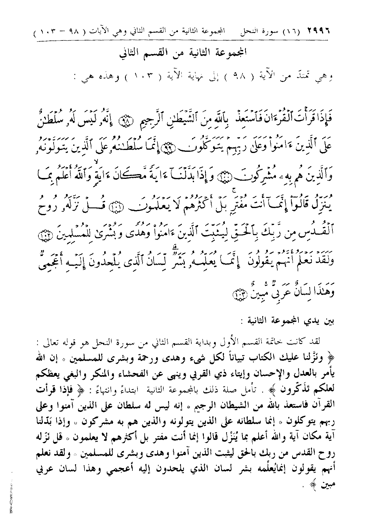 وَنَزَّلْنا عَلَيْكَ الْكِتابَ تِبْياناً لِكُلِّ شَيْءٍ وَهُدىً وَرَحْمَةً وَبُشْرى لِلْمُسْلِمِينَ* إِنَّ اللَّهَ يَأْمُرُ بِالْعَدْلِ وَالْإِحْسانِ وَإِيتاءِ ذِي الْقُرْبى وَيَنْهى عَنِ الْفَحْشاءِ وَالْمُنْكَرِ وَالْبَغْيِ يَعِظُكُمْ لَعَلَّكُمْ تَذَكَّرُونَ. تأمل صلة ذلك بالمجموعة الثانية ابتداء وانتهاء: فَإِذا قَرَأْتَ الْقُرْآنَ فَاسْتَعِذْ بِاللَّهِ مِنَ الشَّيْطانِ الرَّجِيمِ* إِنَّهُ لَيْسَ لَهُ سُلْطانٌ عَلَى الَّذِينَ آمَنُوا وَعَلى رَبِّهِمْ يَتَوَكَّلُونَ* إِنَّما سُلْطانُهُ عَلَى الَّذِينَ يَتَوَلَّوْنَهُ وَالَّذِينَ هُمْ بِهِ مُشْرِكُونَ* وَإِذا بَدَّلْنا آيَةً مَكانَ آيَةٍ وَاللَّهُ أَعْلَمُ بِما يُنَزِّلُ قالُوا إِنَّما أَنْتَ مُفْتَرٍ بَلْ أَكْثَرُهُمْ لا يَعْلَمُونَ* قُلْ نَزَّلَهُ رُوحُ الْقُدُسِ مِنْ رَبِّكَ بِالْحَقِّ لِيُثَبِّتَ الَّذِينَ آمَنُوا وَهُدىً وَبُشْرى لِلْمُسْلِمِينَ* وَلَقَدْ نَعْلَمُ أَنَّهُمْ يَقُولُونَ إِنَّما يُعَلِّمُهُ بَشَرٌ لِسانُ الَّذِي يُلْحِدُونَ إِلَيْهِ أَعْجَمِيٌّ وَهذا لِسانٌ عَرَبِيٌّ مُبِينٌ.